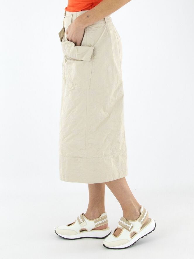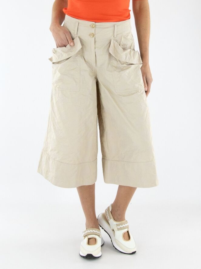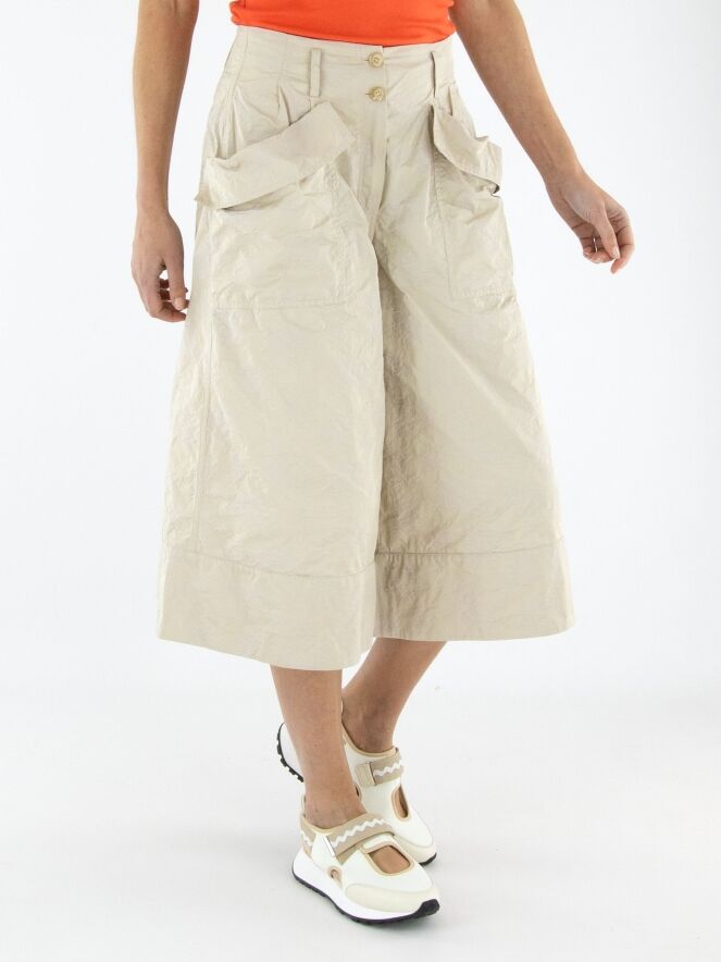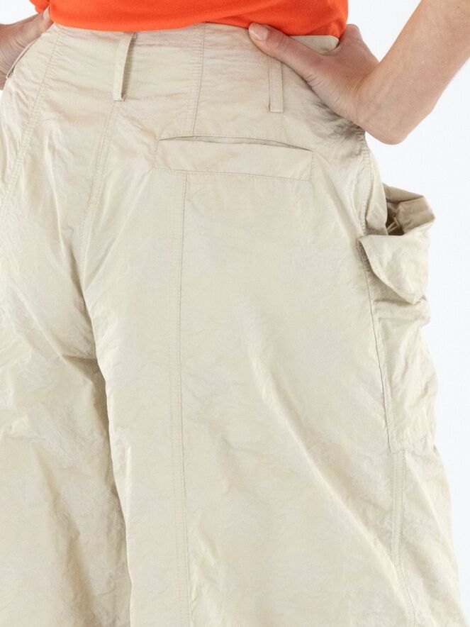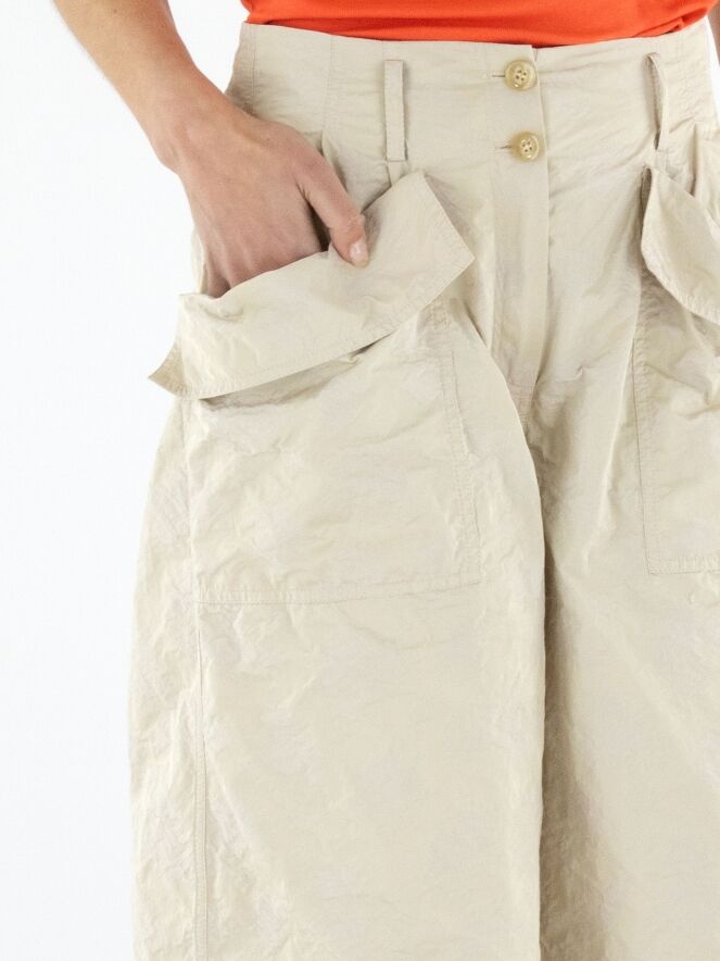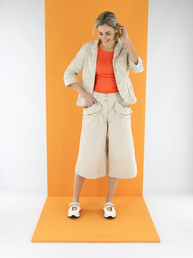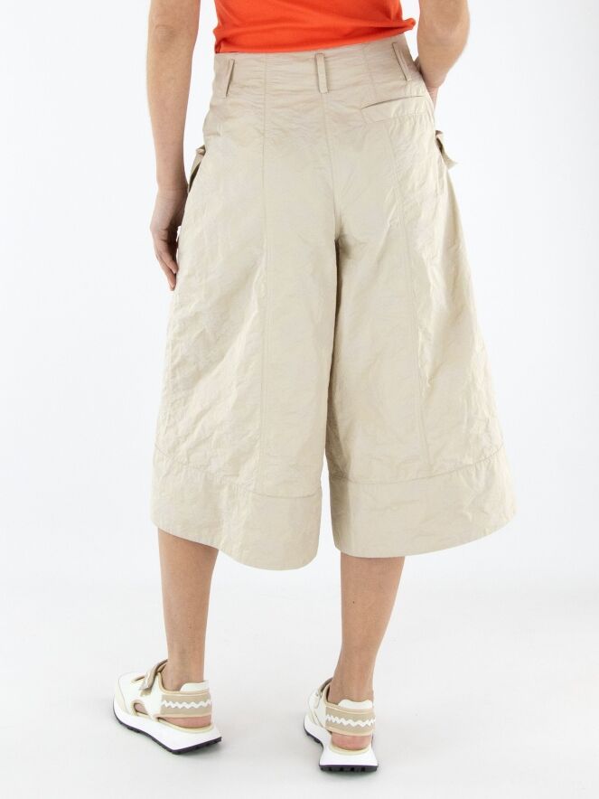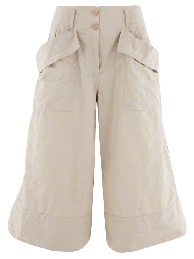 Eine Bermuda von Annette Görtz mit einem Jacquardmuster in Sand- und Beigetönen. In der Kante des diagonalen, breiten Umschlags der Taschen befindet sich ein Kordelzug in einer Tunnelverarbeitung, der einen Falteneffekt erzeugt. Diese Bermuda kann bei 30 Grad gewaschen werden.