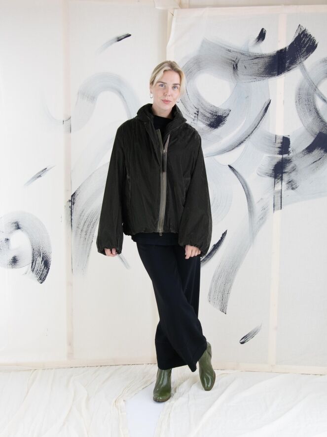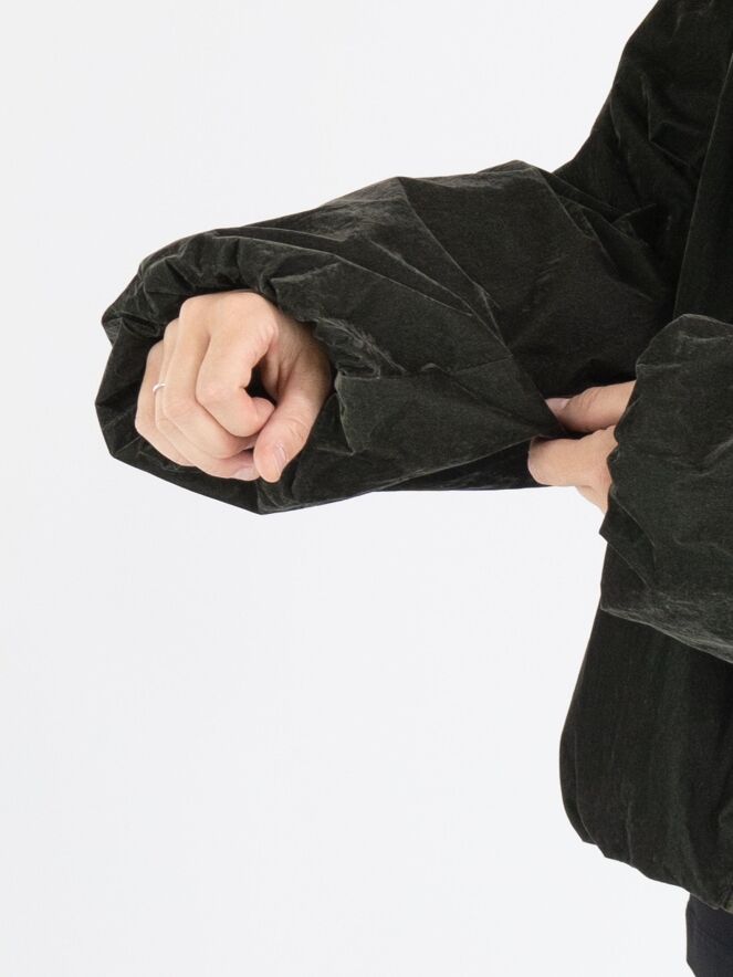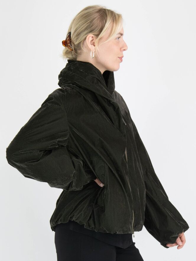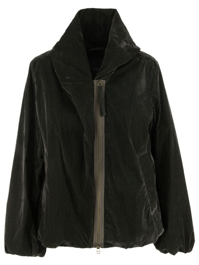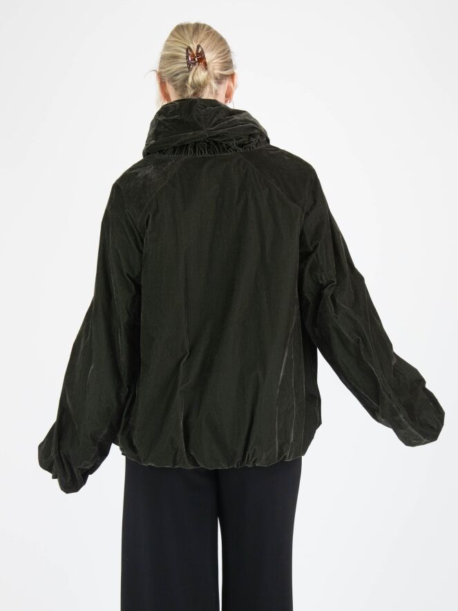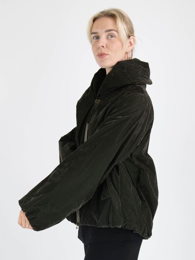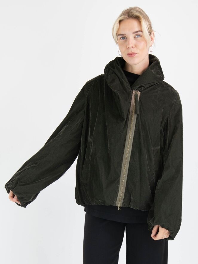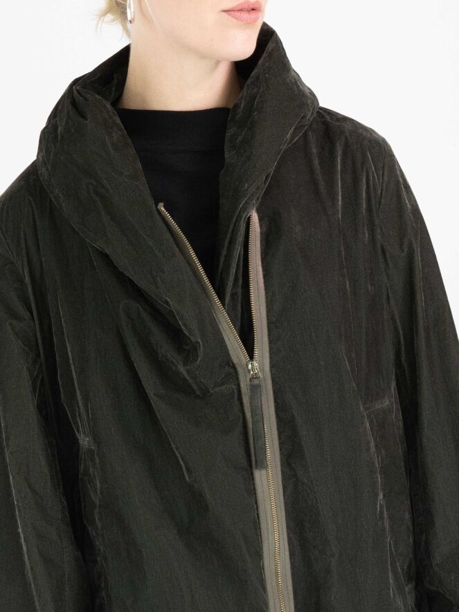 Ein Parka von Annette Görtz in dunkler Khakifarbe. Der Parka besteht aus leichtem Velours. Er hat einen Reißverschluss und Eingrifftaschen und darf nicht gewaschen werden.