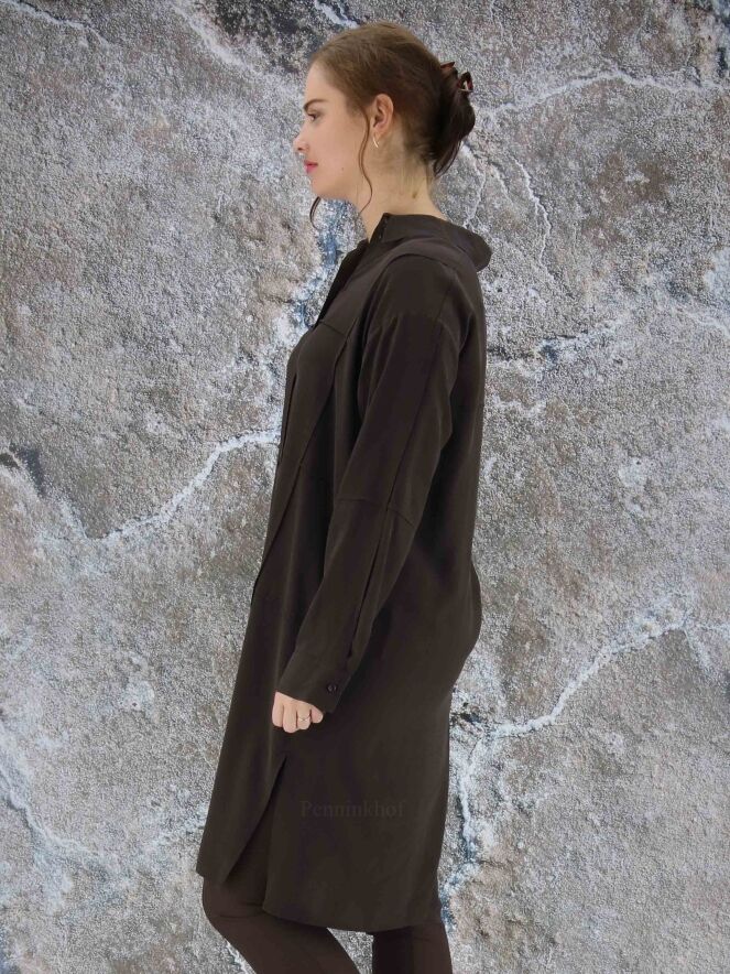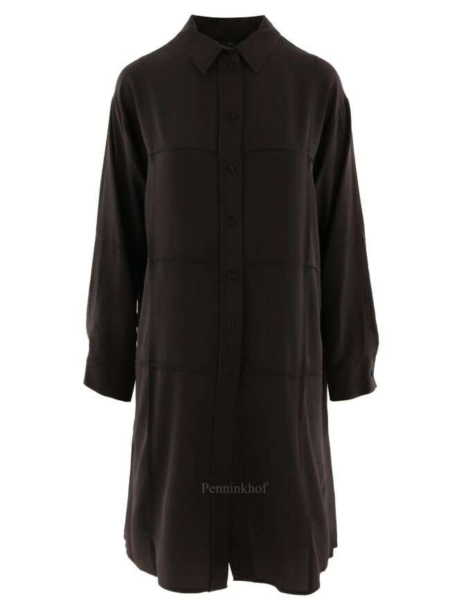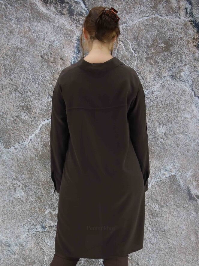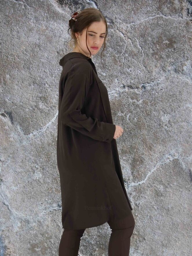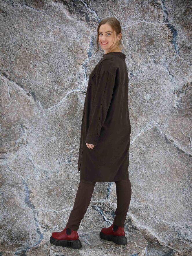 Eine lange Bluse der Designermode von Annette Görtz in der Farbe Aubergine. Die Bluse hat aufgrund der umgekehrten Nähte ein Rautenmuster auf der Vorderseite. Der untere Saum ist seitlich mit hohen Schlitzen versehen. Diese Bluse kann bei 30 Grad gewaschen werden.