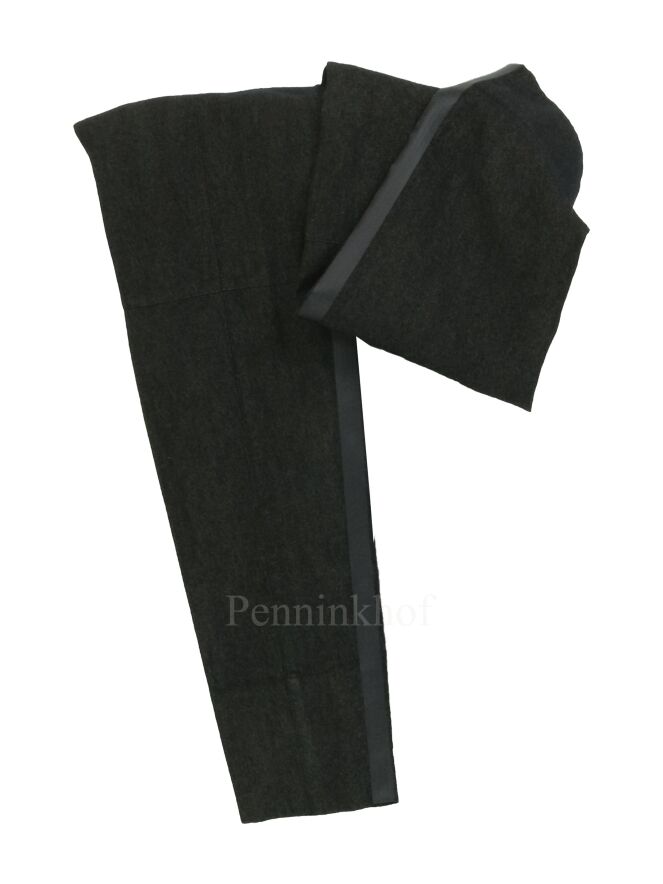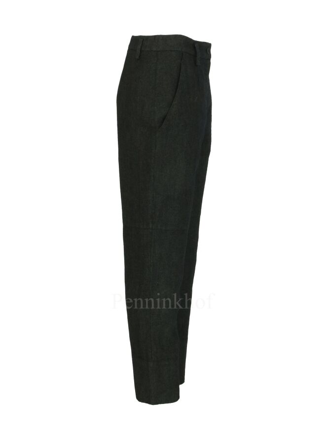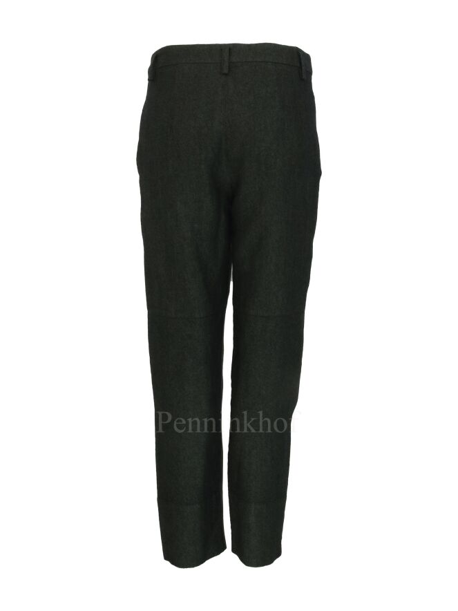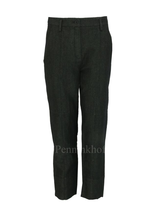 Eine melierte Stoffhose der Designermode von Annette Görtz in Schwarz und Olivgrün. Die Hose kommt mit Eingriffstaschen. Die Innenseite der Hosenbeine ist mit einem Längsstreifen aus Mattsatin versehen. Diese Hose kann von Hand gewaschen werden.