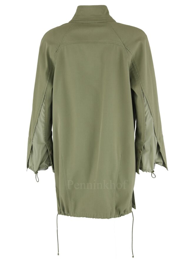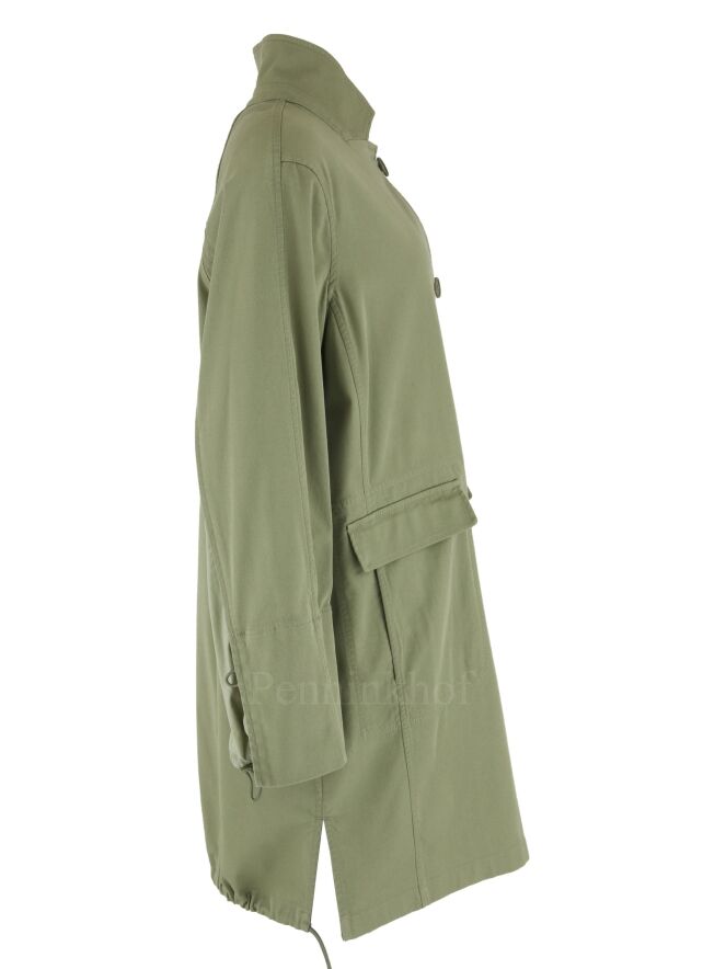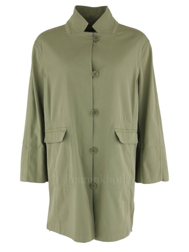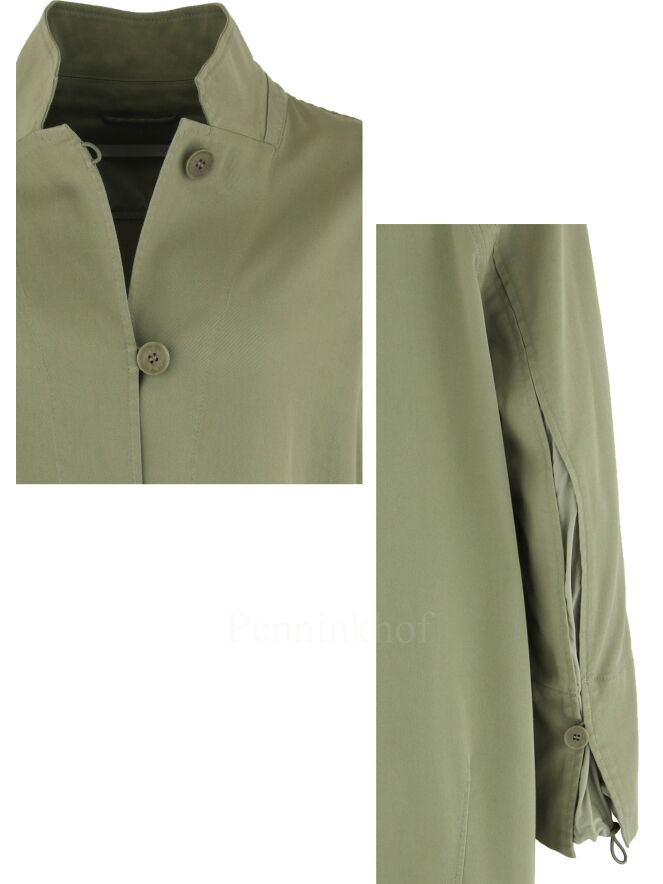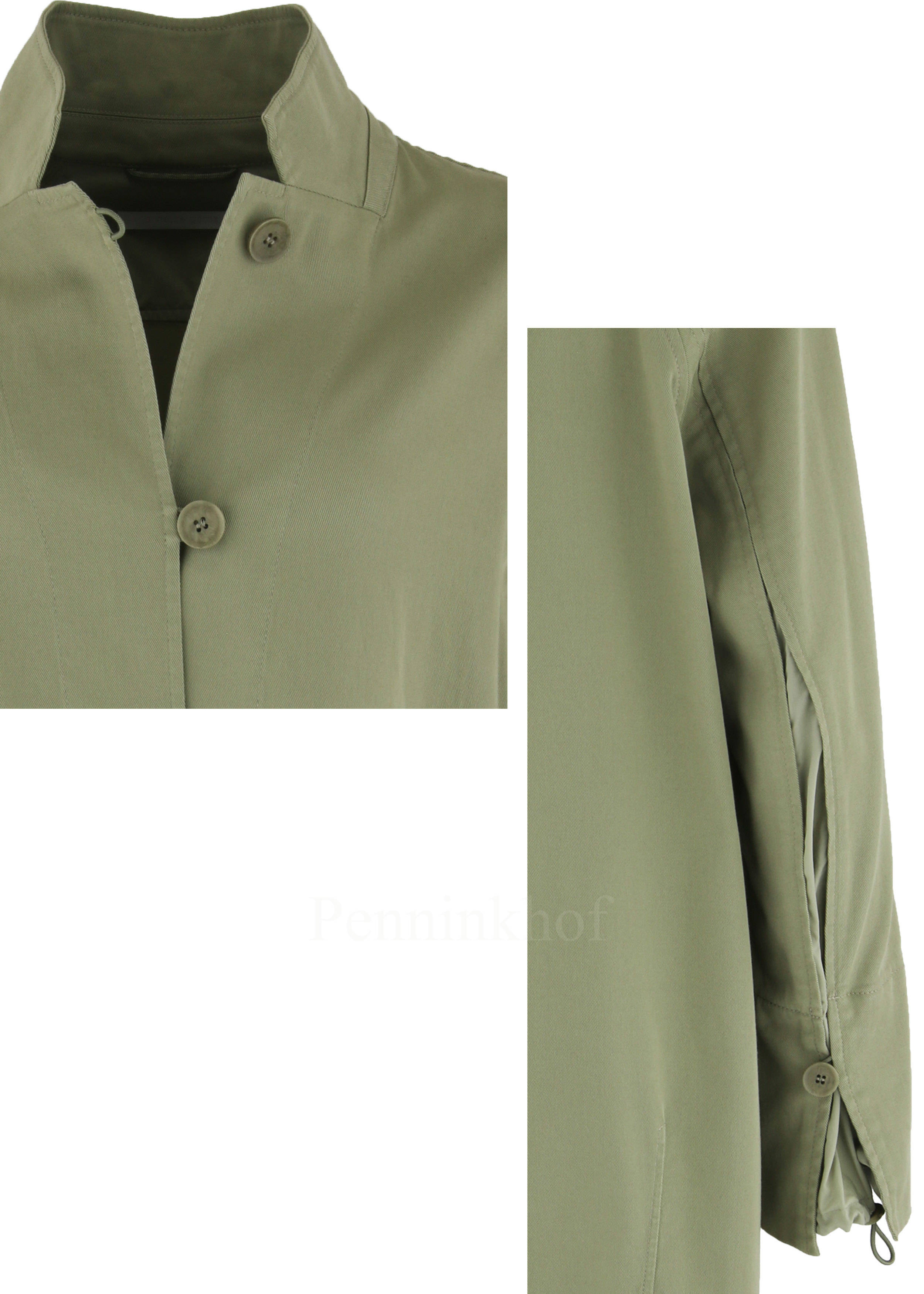 Ein halblanger Blazer der Designermode von Annette Görtz in einem sanften Olivgrün. Der Blazer wird mit 5 Knöpfen geschlossen. Der untere Saum ist seitlich jeweils mit einem Schlitz versehen. Im hinteren unteren Saum befindet sich ein Kordelzug, mit dem sich ein geraffter Effekt erzielen lässt. Dieser Blazer kann bei 30 Grad gewaschen werden.