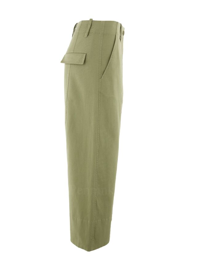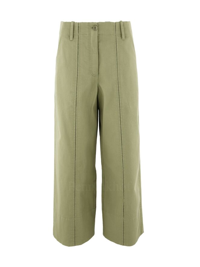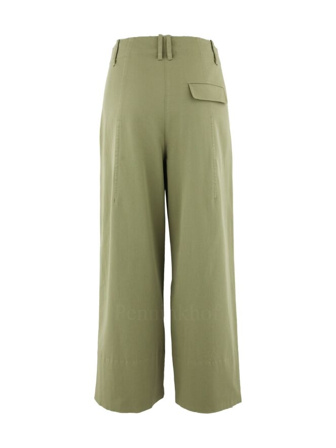 Eine Stoffhose der Designermode von Annette Görtz in einem hellen Olivgrün. Die Hose kommt mit Seitentaschen. Über die Mitte Hosenbeine verläuft eine offene doppelte Steppnaht mit einem matten Satinbesatz. Diese Hose kann bei 30 Grad gewaschen werden.
