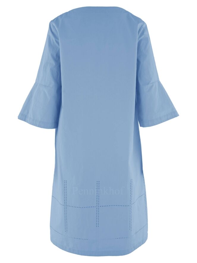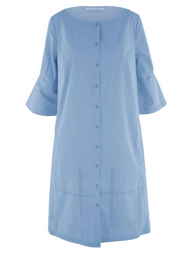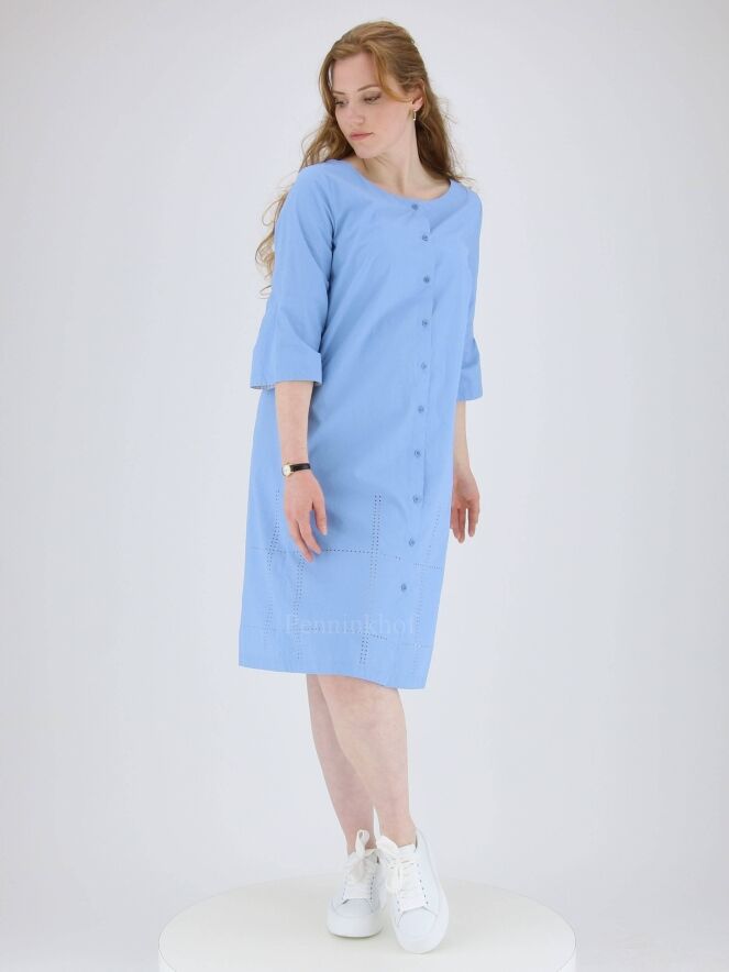 Ein Button-Down-Kleid der Designermode von Annette Görtz in einem sanften Blau. Das Kleid hat einen Rundhalsausschnitt und halblange Ärmel. Unterhalb der Kniehöhe ist das Kleid im Blockmuster perforiert. Dieses Kleid kann bei 30 Grad in der Waschmaschine gewaschen werden.