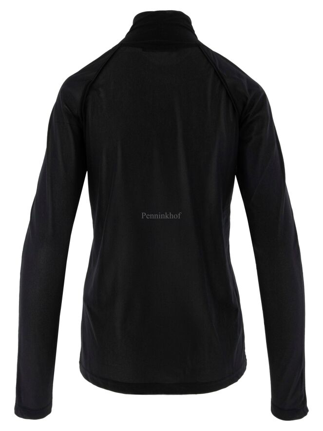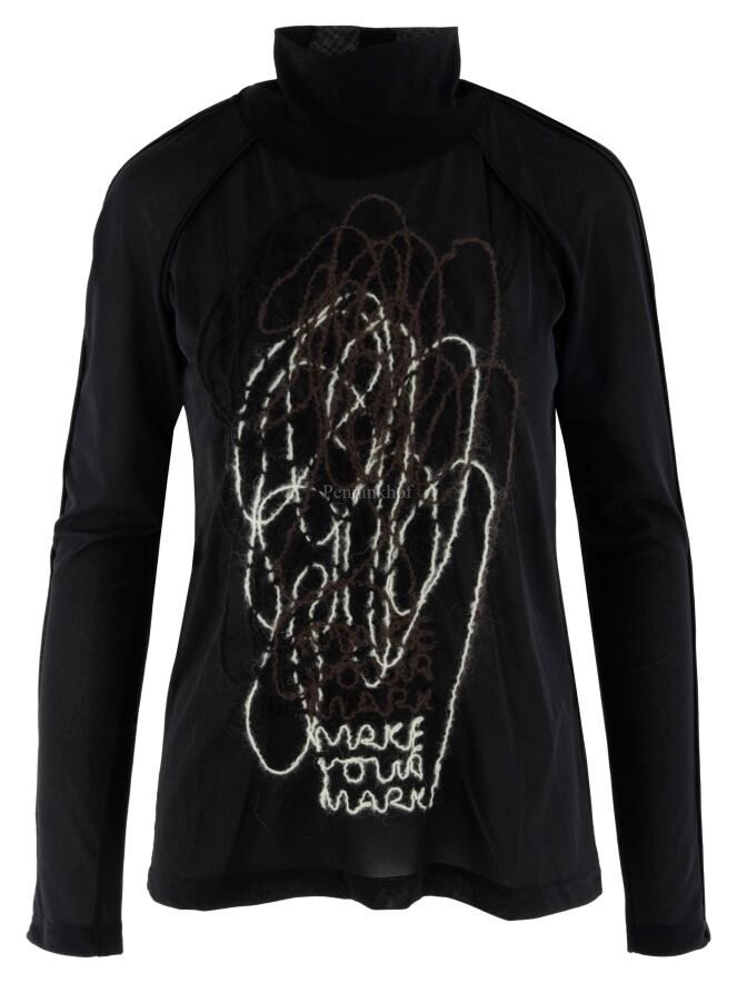 Ein Shirt von Annette Görtz in schwarz mit aufgesticktem Muster aus Nähten in cremeweiß und mokkabraun. Das Shirt hat einen fallenden Kragen am Halsausschnitt und kann bei 30 Grad gewaschen werden.
