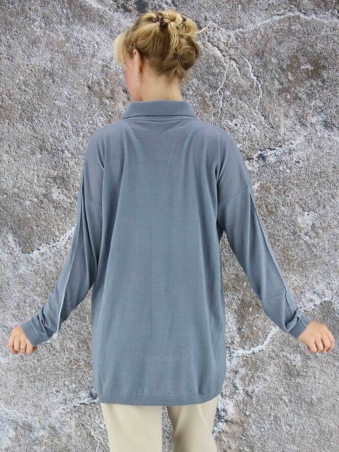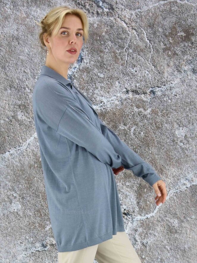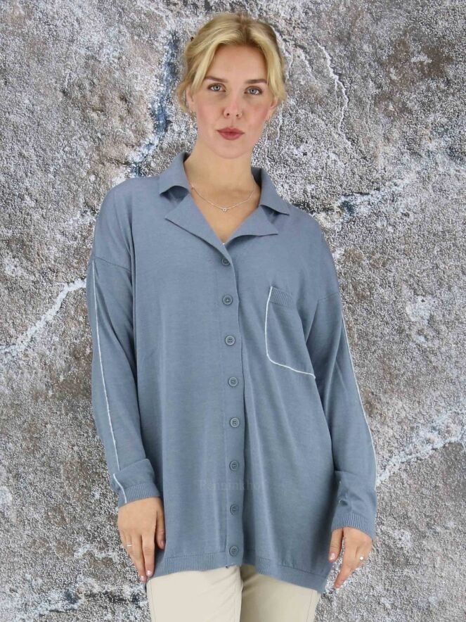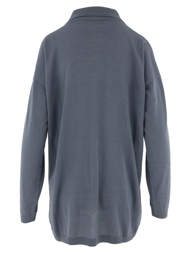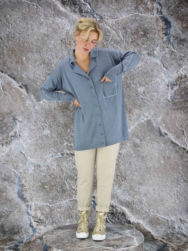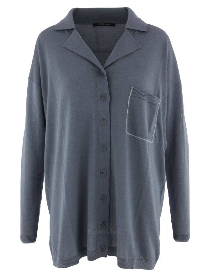 Ein hochwertiger Cardigan der Designermode von Annette Görtz in Graublau. Auf der Oberseite der Ärmel und an den Rändern der Brusttasche befindet sich ein hellblauer Streifen. Diese Strickweste kann von Hand gewaschen werden.