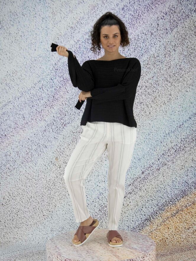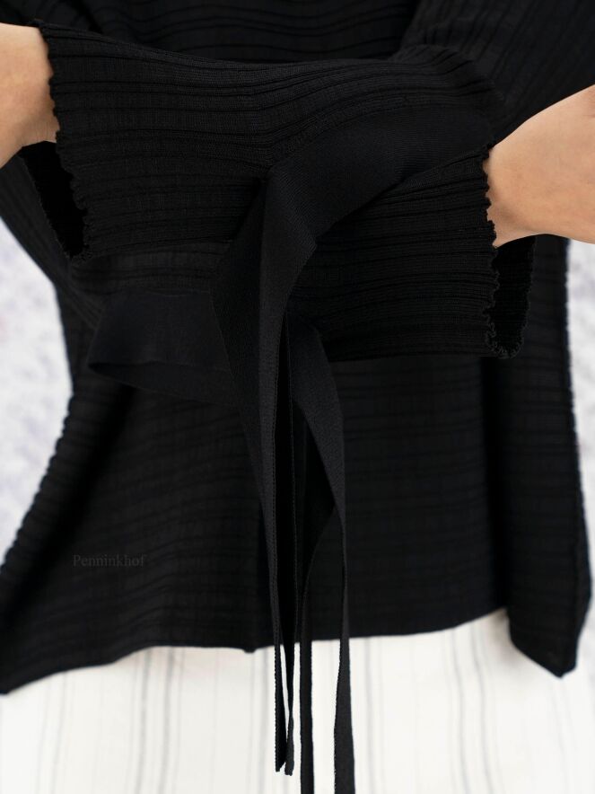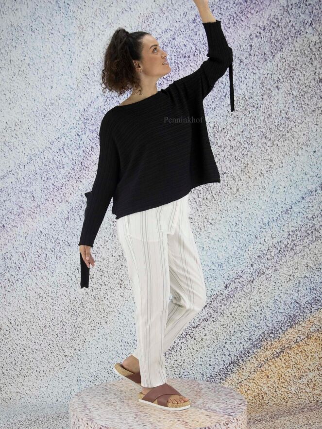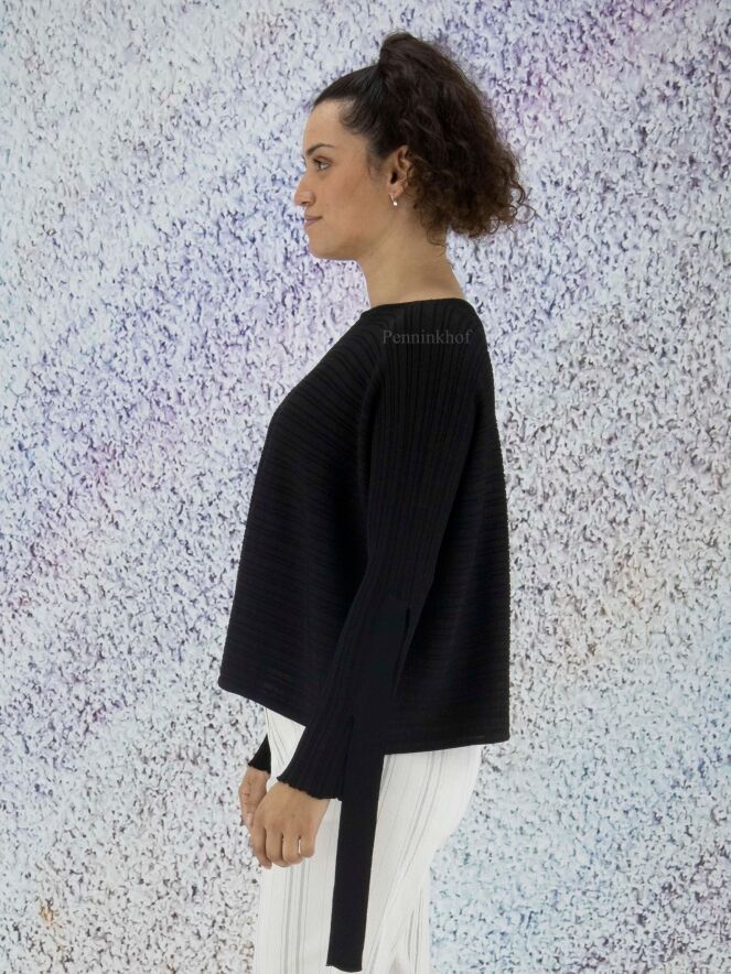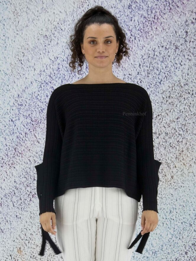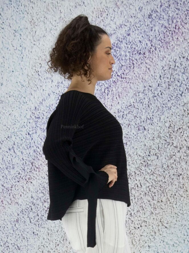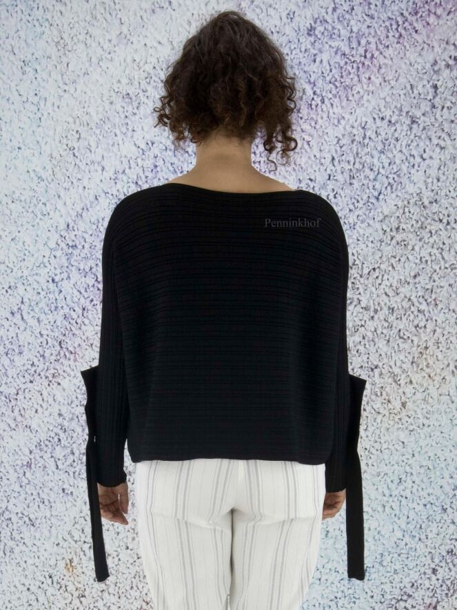 Ein hochwertiger kurzer Pullover der Designermode von Annette Görtz in Schwarz. Der Pullover kommt mit einer horizontalen Streifenstruktur. Am Abschluss der langen Ärmel befindet sich eine Öffnung mit 2 Bändern, mit denen der Ärmel befestigt werden kann. Der Pullover hat einen weiten Rundhalsausschnitt und kann von Hand gewaschen werden.