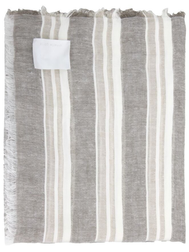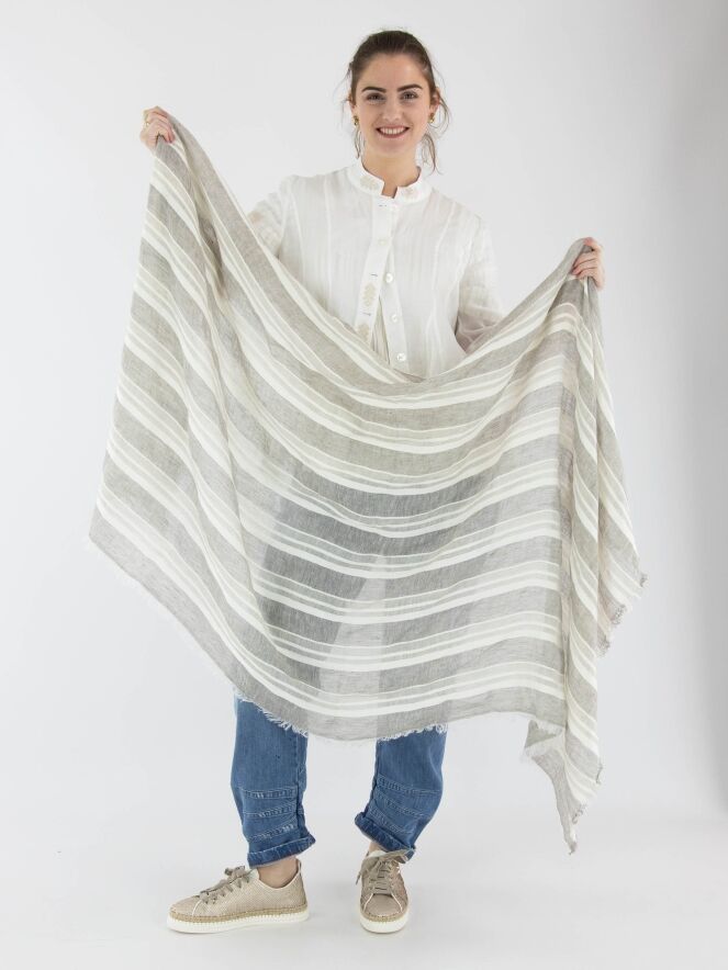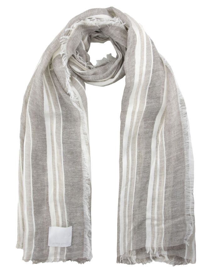 Ein leicht transparenter Schal von Annette Görtz mit einem Streifenmuster in verschiedenen Beigetönen und Cremeweiß. Die Ränder des Schals sind fein ausgefranst. Dieser Schal sollte von Hand gewaschen werden.