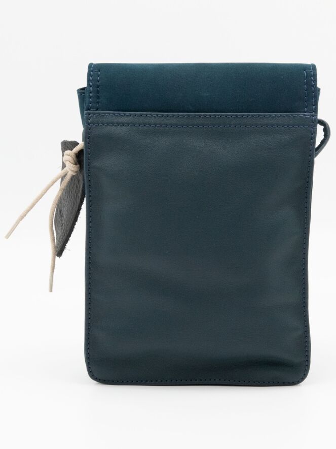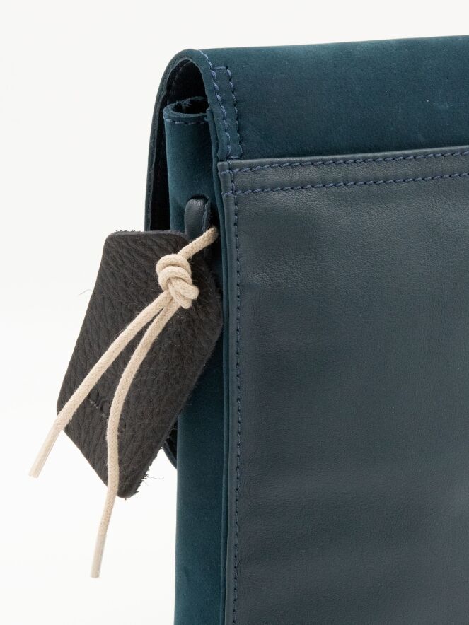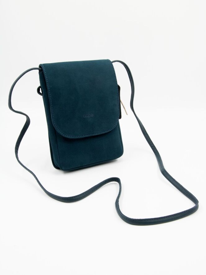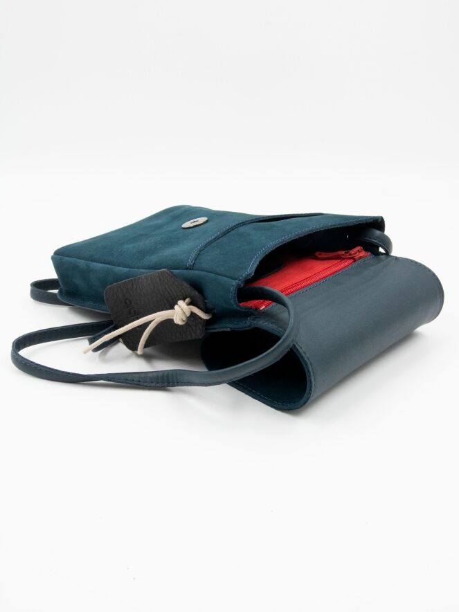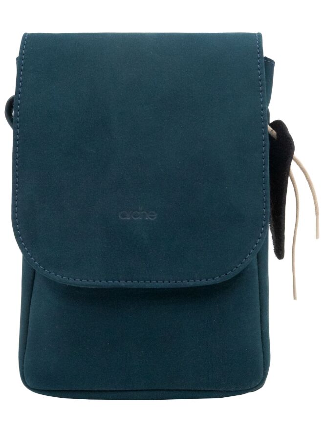 Tasche der Marke Arche aus Veloursleder in Petrolblau. Die Tasche hat einen langen Schulterriemen und ein kleines Reißverschlussfach innen.