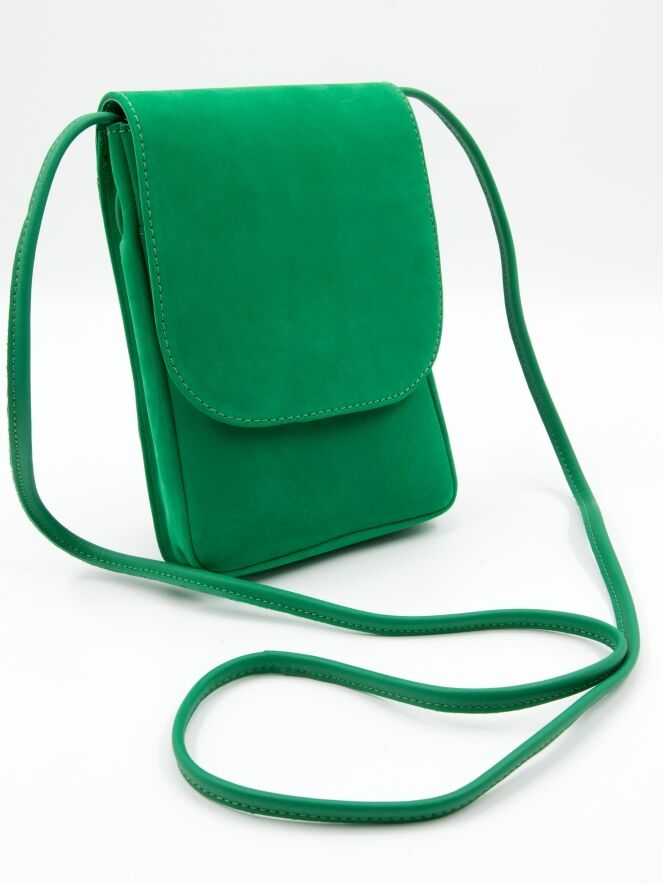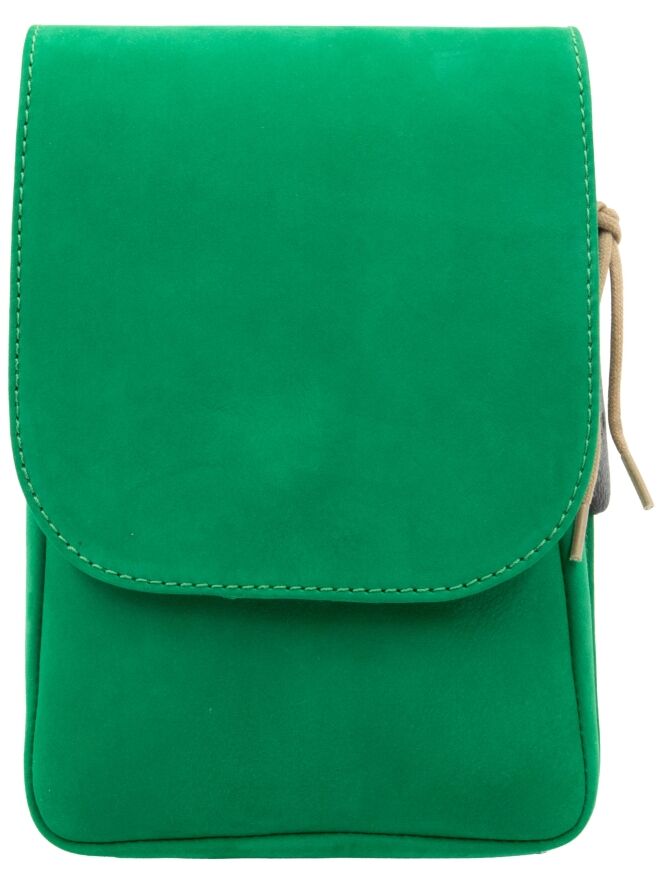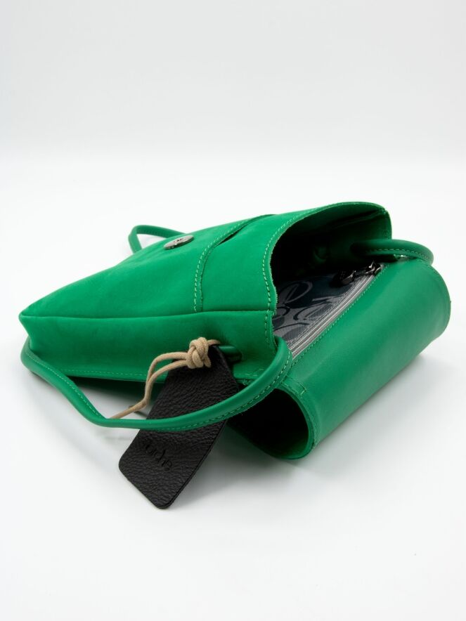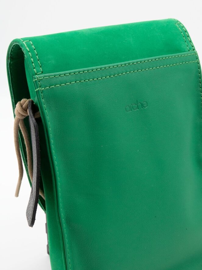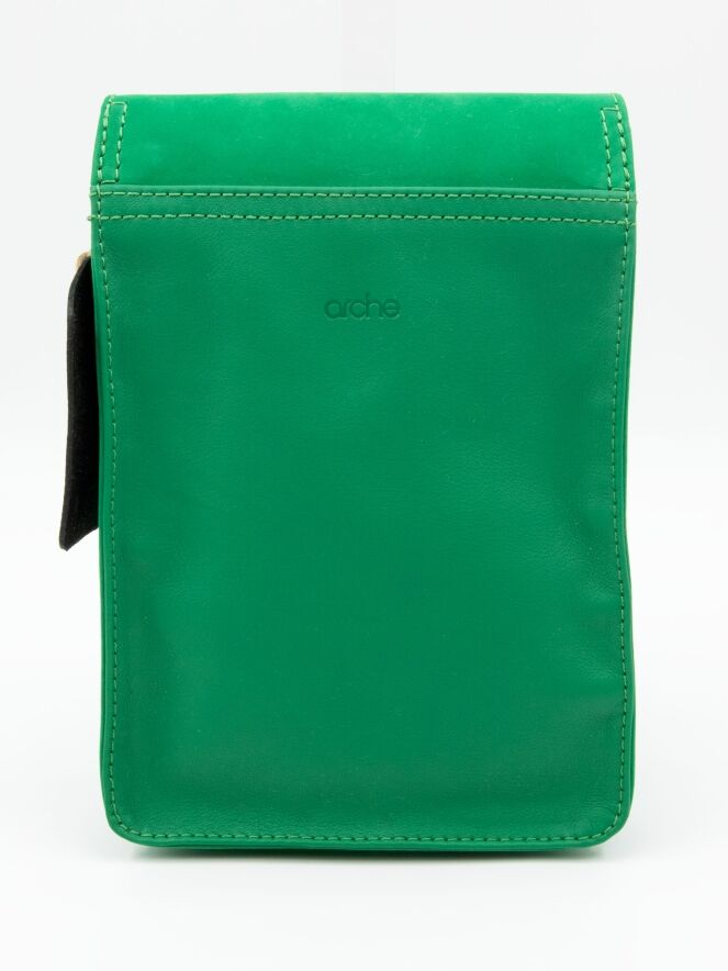 Eine Tasche von Arche aus Leder in Smaragdgrün. Die Tasche hat einen langen Schulterriemen und ein kleines Reißverschlussfach im Inneren.