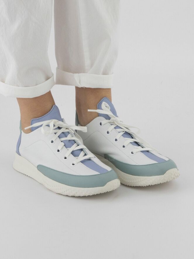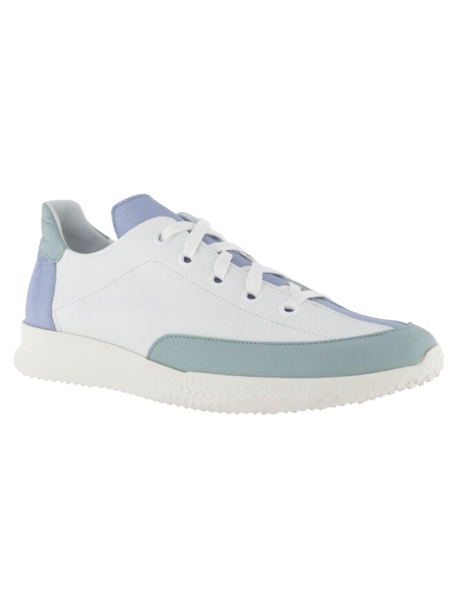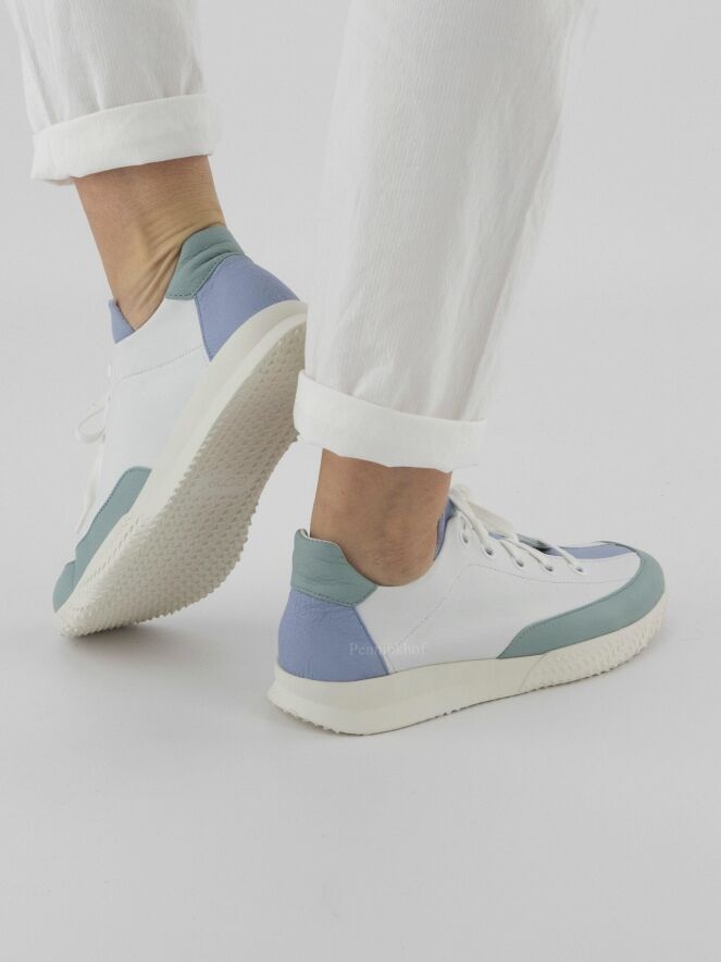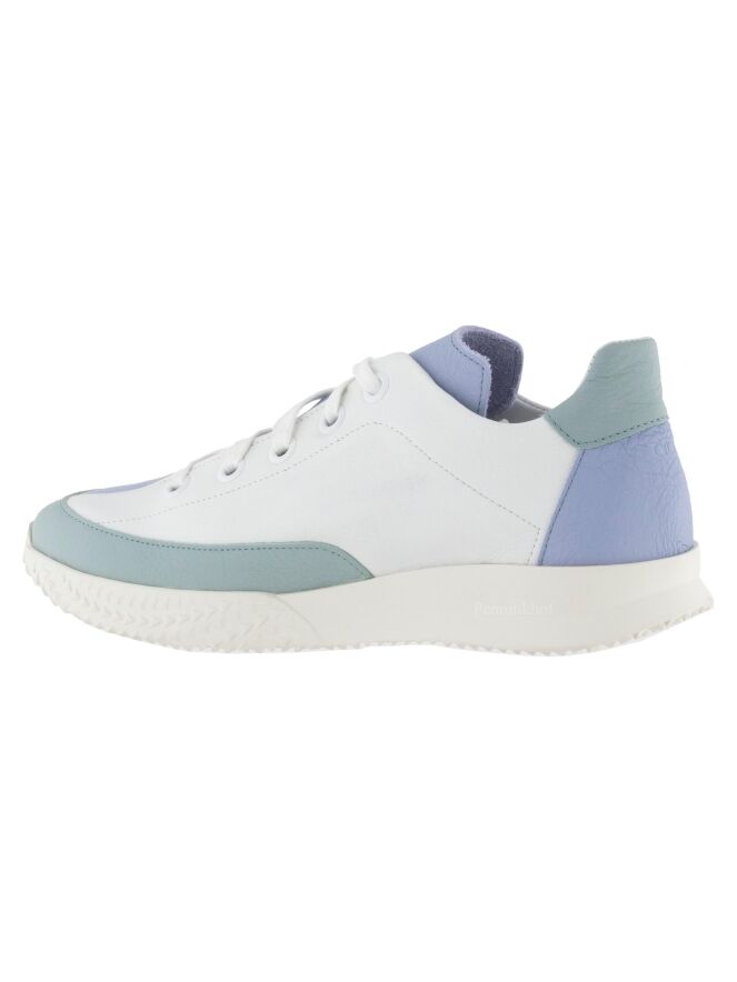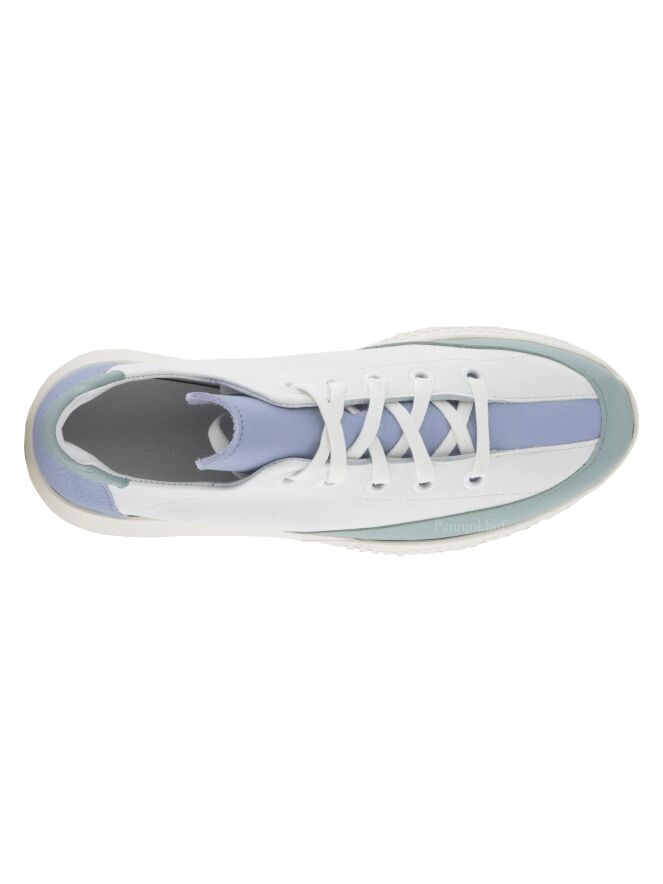 Ein weißer Sneaker der Schuhmarke Arche. Entlang der Kante des Spanns bis zur Hälfte des Sneakers verläuft ein pastell-blaugrauer Nubukbesatz. Der Absatz ist pastellviolett mit einem blaugrauen oberen Rand. Die weiße Sohle ist dekorativ dreieckig gezackt.