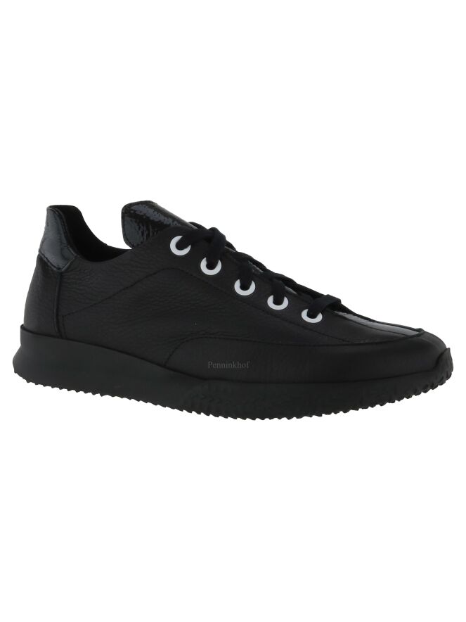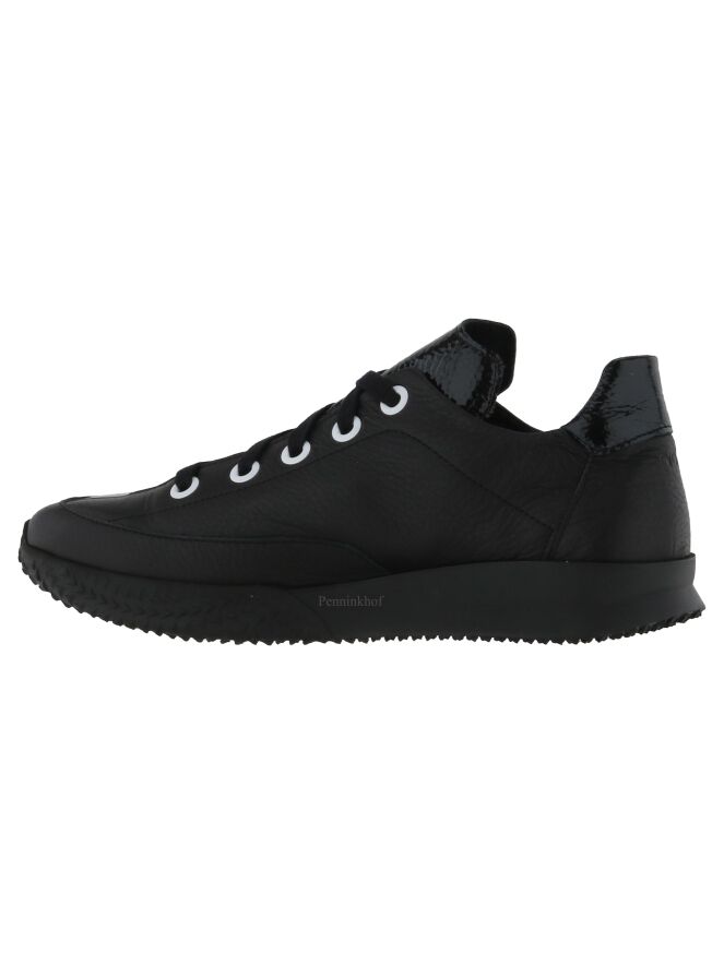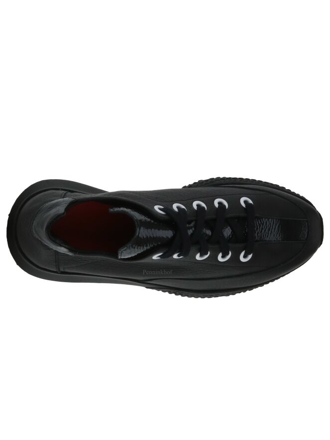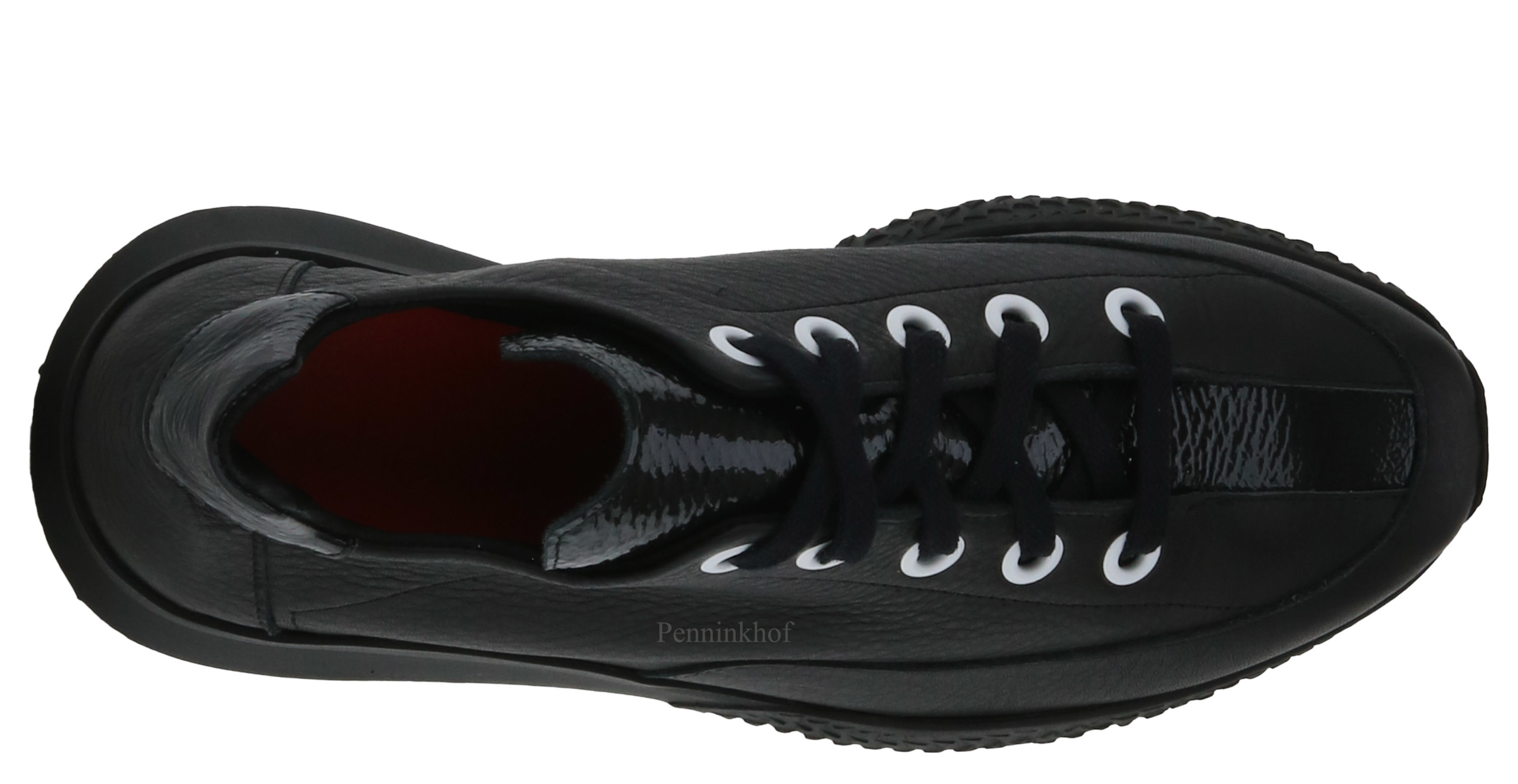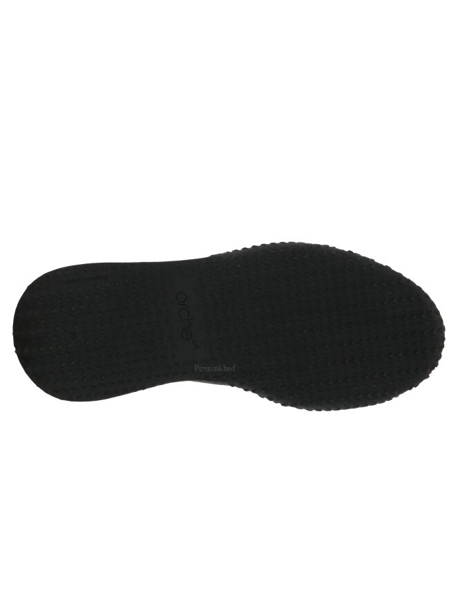 Ein Sneaker der Schuhmarke Arche in Schwarz. Von der Schuhspitze des Sneakers verläuft ein breiter schwarzer Lackstreifen bis zur Zunge. Dieser Farbakzent spiegelt sich an der Ferse wider. Die Innenseite ist mit Leder gefüttert.