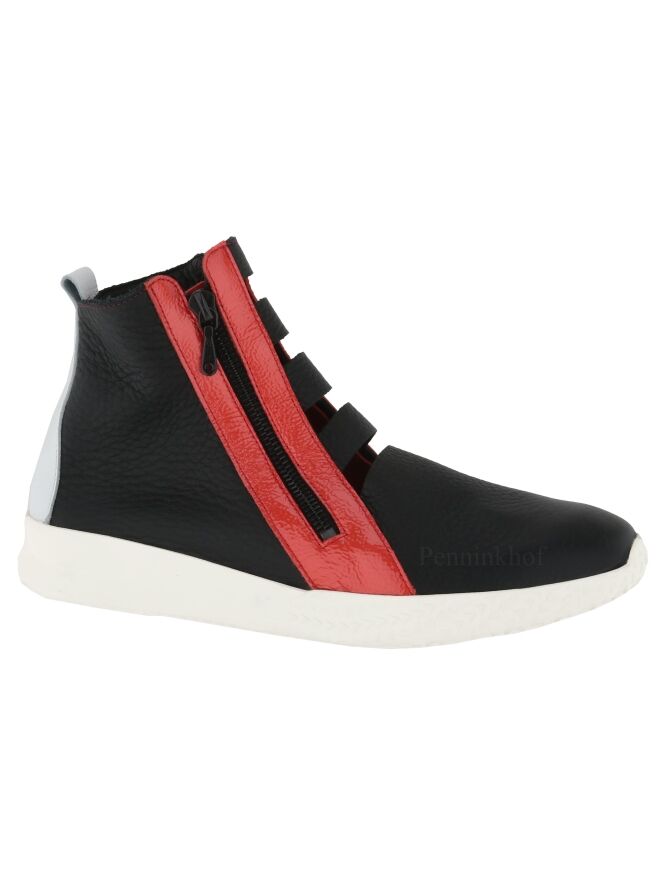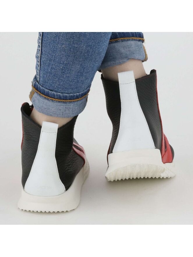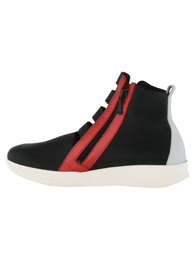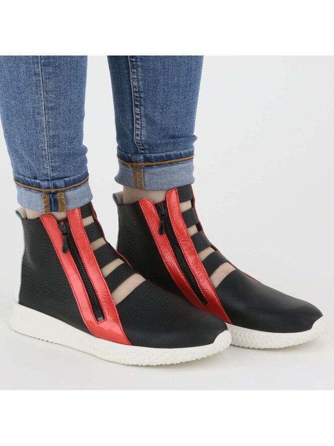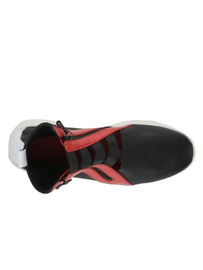 Ein hoher Sneaker der Schuhmarke Arche in Schwarz. Die Seiten sind mit einem doppelten roten Lackstreifen versehen. Die Ferse ist aus weißem Leder. Der vordere Fußbereich ist teilweise offen. Dieser Sneaker hat kein Innenfutter.