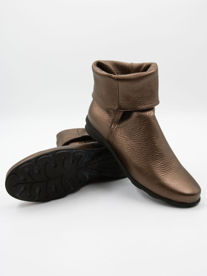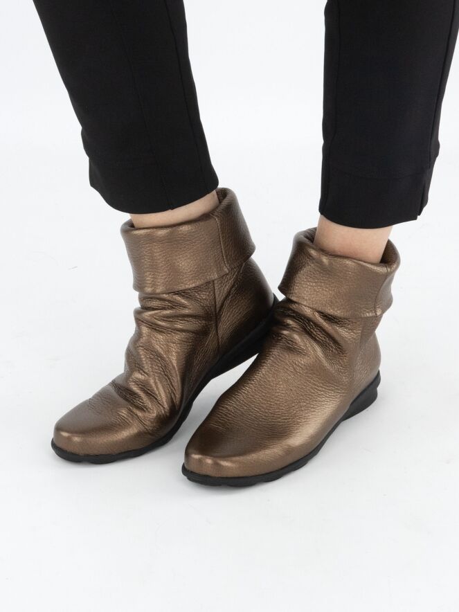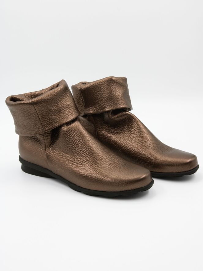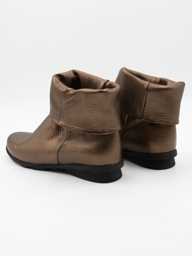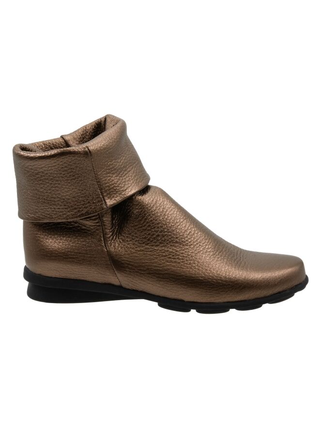 Ein Stiefelette von Arche in Kupferfarbe. Der Schaft hat einen breiten Umschlag. Die Sohle ist am Absatz leicht erhöht. Das Innere ist ungefüttert.