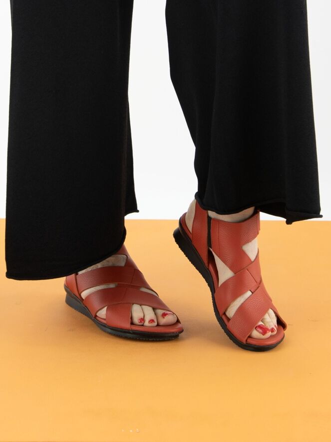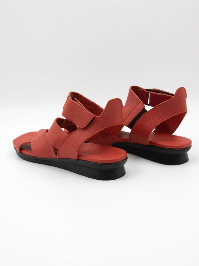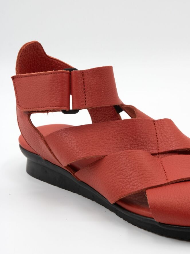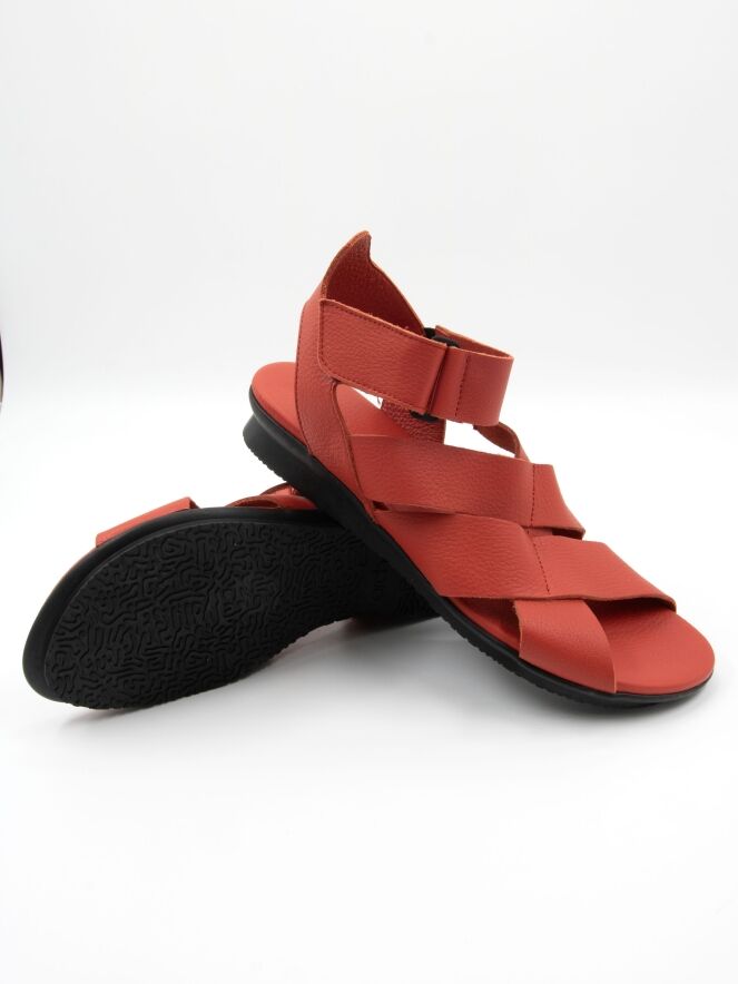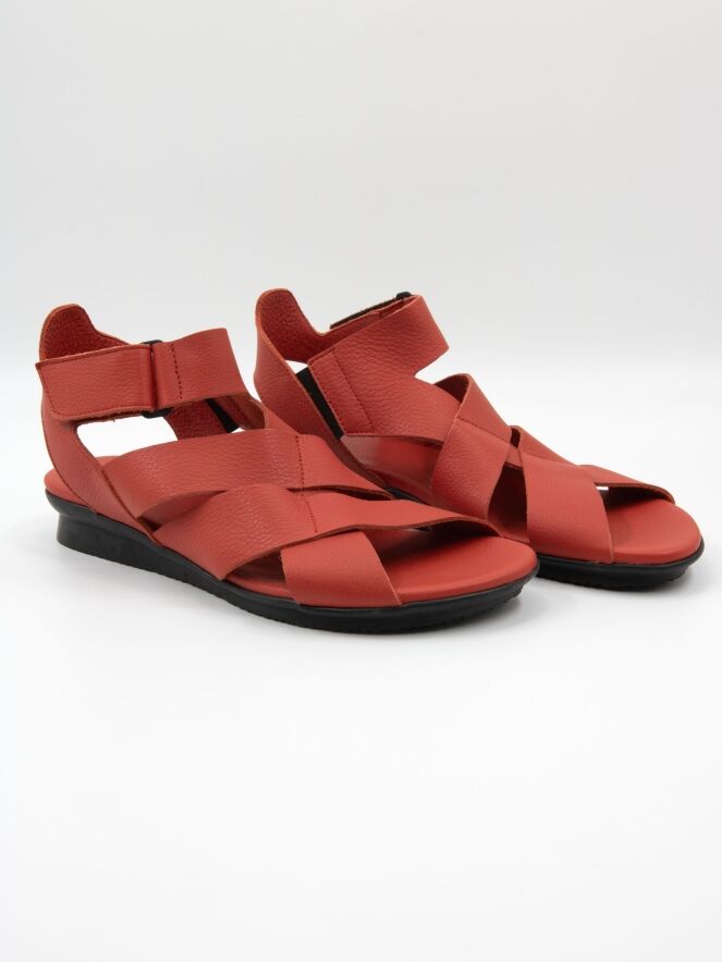 Eine Sandale von Arche in Rot. Das Leder ist über dem Vorfuß gekreuzt, und der Fersenriemen ist mit Klettverschluss verstellbar. Das Fußbett besteht aus dem gleichen Leder wie die Sandale.