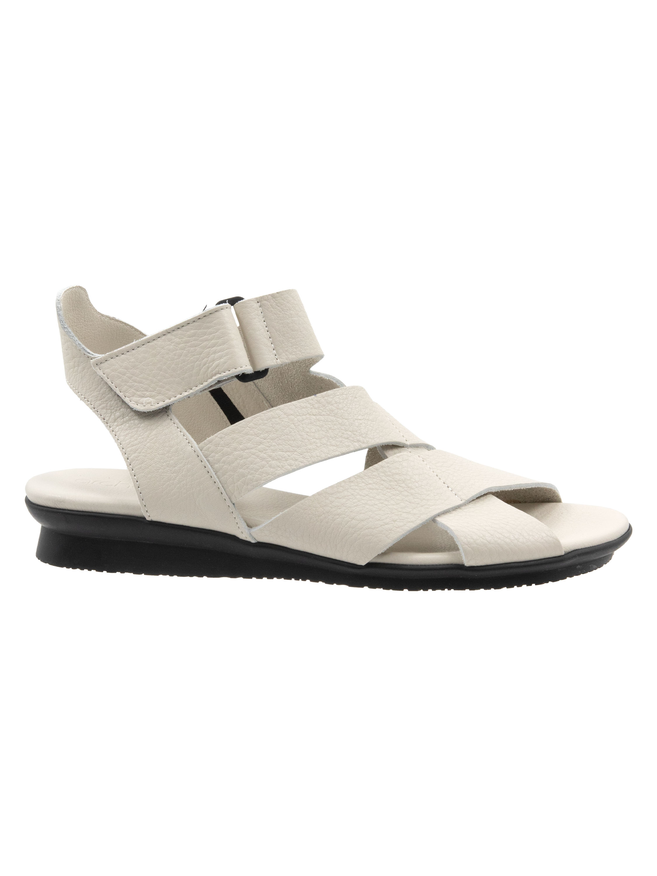 Eine Sandale von Arche in Kreideweiß. Das Leder ist über dem Vorfuß gekreuzt, und der Fersenriemen ist mit Klettverschluss verstellbar. Das Fußbett ist mit dem gleichen Leder wie die Sandale bezogen.