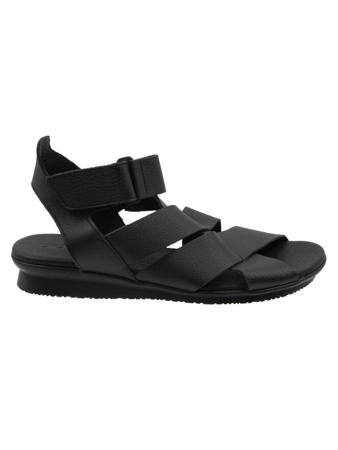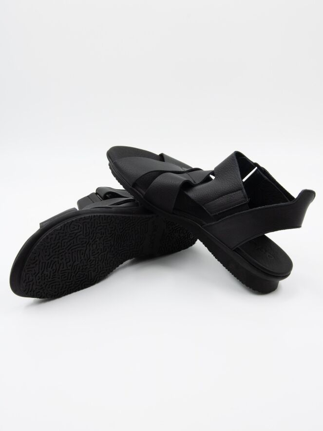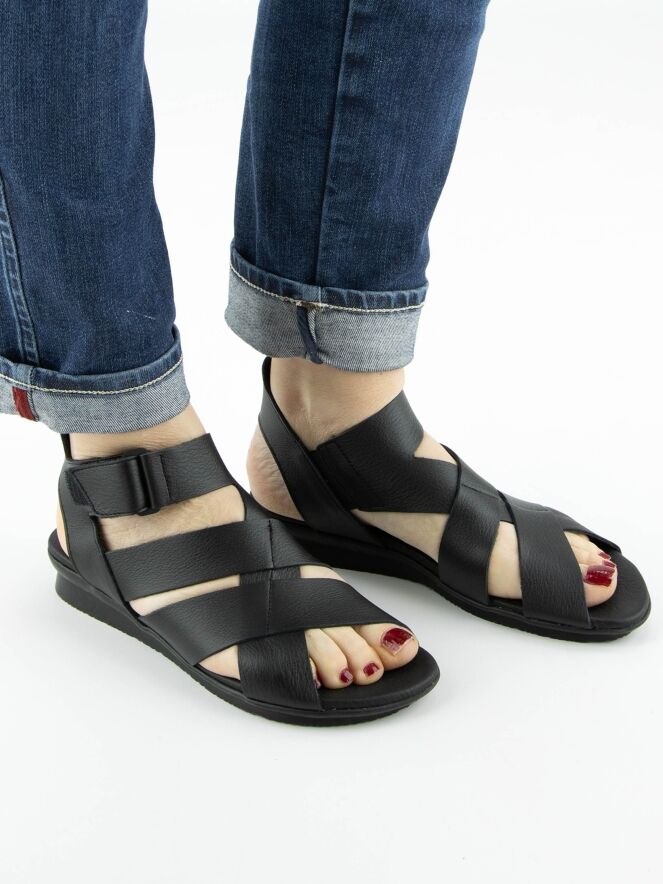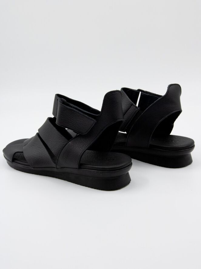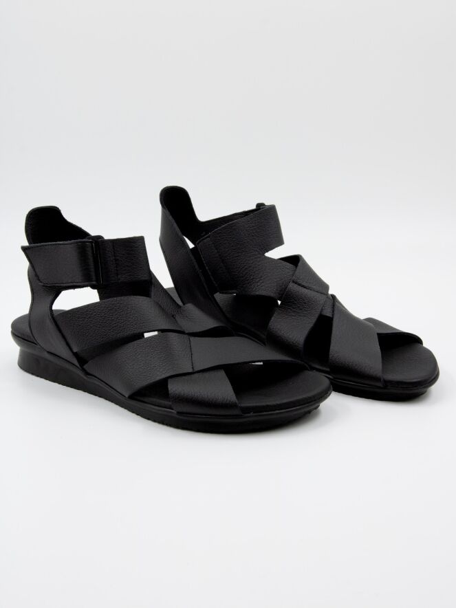 Ein Sandale von Arche in der Farbe Schwarz. Das Leder ist über dem Vorfuß gekreuzt, und der Riemen zur Ferse ist mit Klettverschluss verstellbar. Das Fußbett besteht aus dem gleichen Leder wie die Sandale.