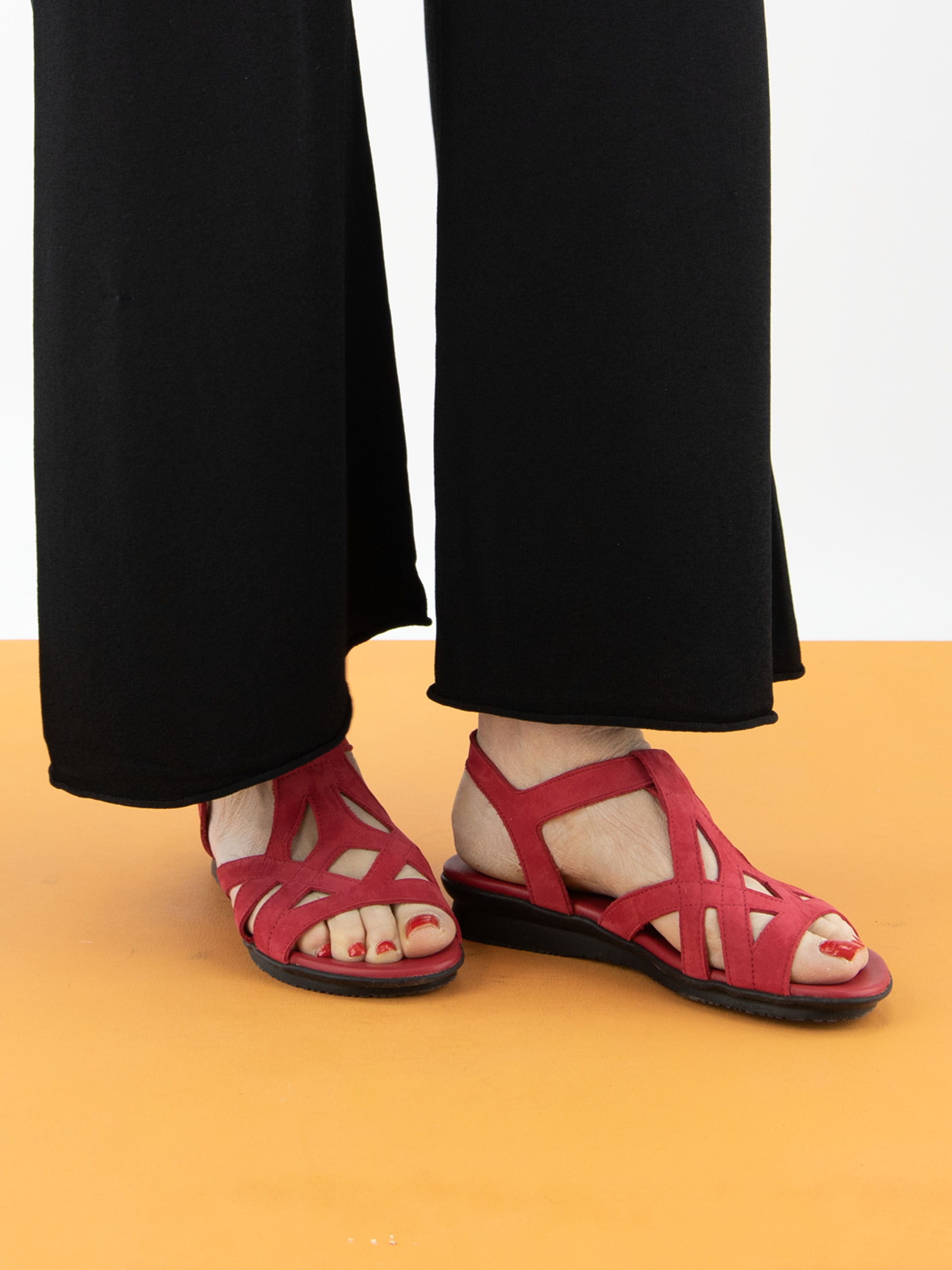 Eine Sandale von Arche in Himbeerrot. Das Nubukleder ist in einer offenen Struktur über dem Vorfuß geschnitten. Der Fersenriemen ist mit Klettverschluss verstellbar. Das Fußbett ist mit weichem Leder ausgekleidet.