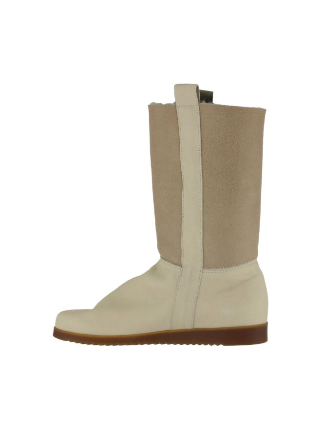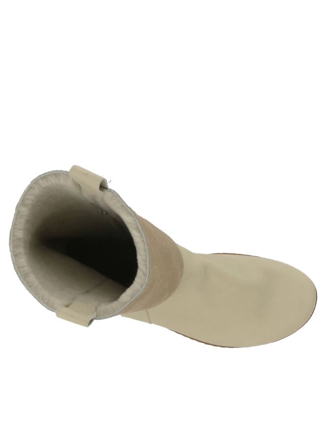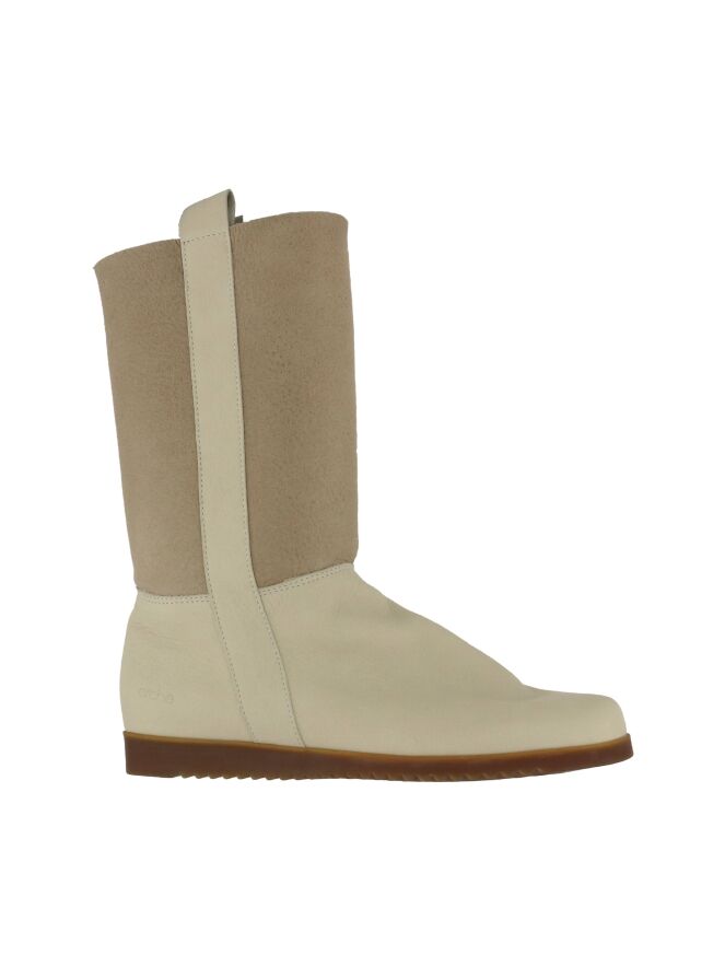 Ein halbhoher Stiefel der Schuhmarke Arche in Cremeweiß. Der Schaft kommt in einem zarten Taupe. Beiden Seiten des Schafts sind mit einem cremeweißen Streifen versehen. Die Latexsohle ist cognacfarben. Der Stiefel ist vorne abgerundet und mit Fell gefüttert.