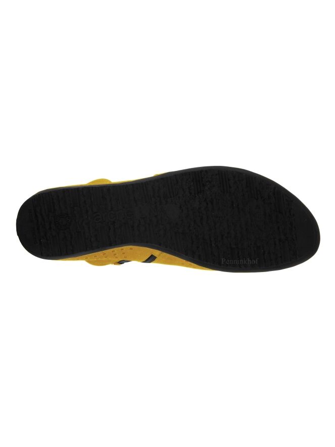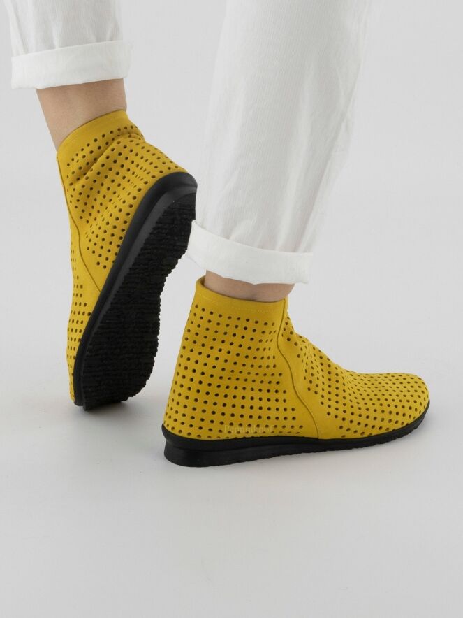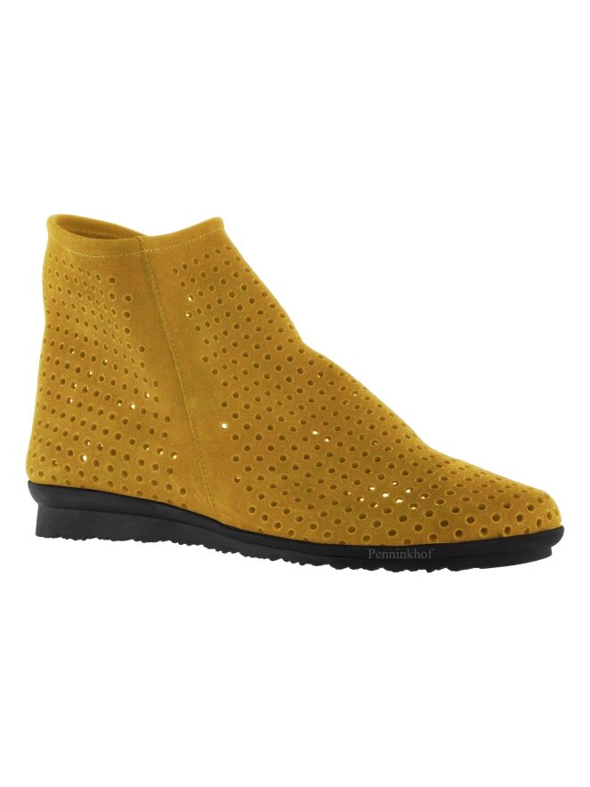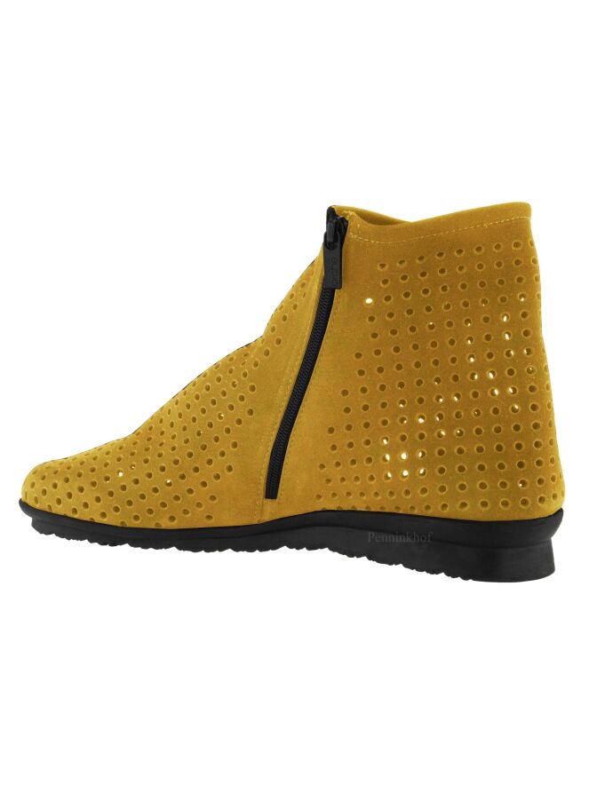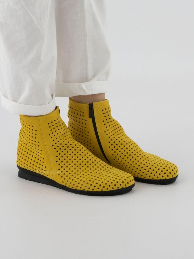 Eine kurze Stiefelette der Schuhmarke Arche in Gelb. Das Nubuk-Wildleder leicht perforiert. Auf der Innenseite befindet sich ein Reißverschluss. Die Stiefelette ist vorn abgerundet.