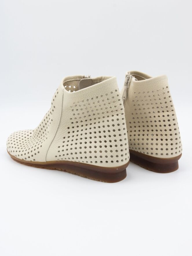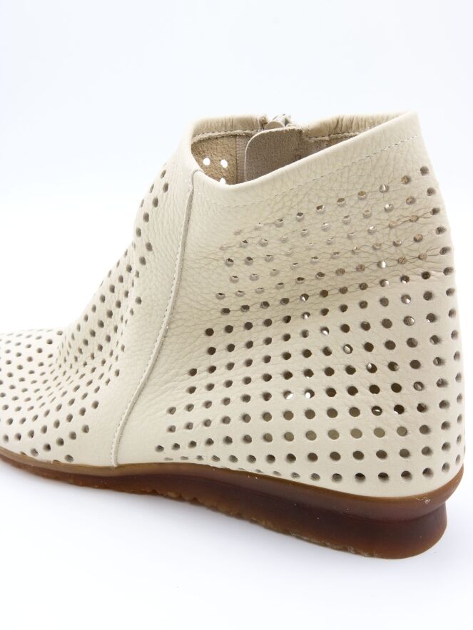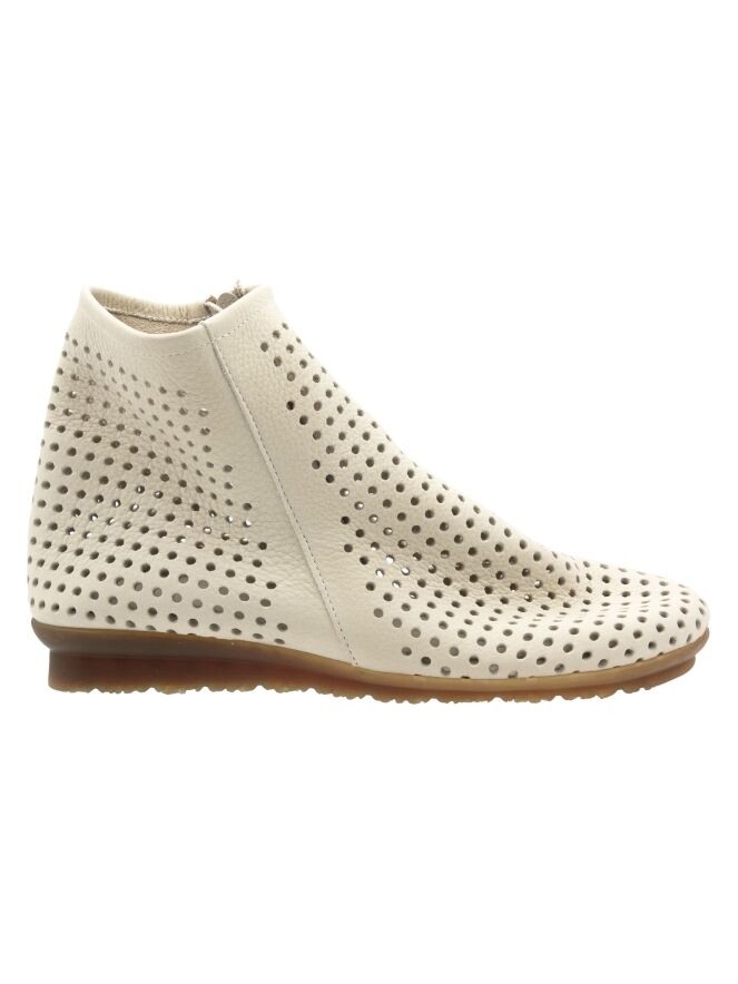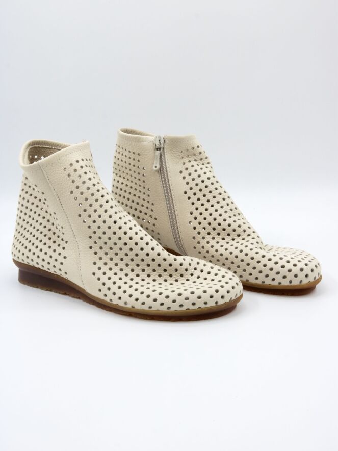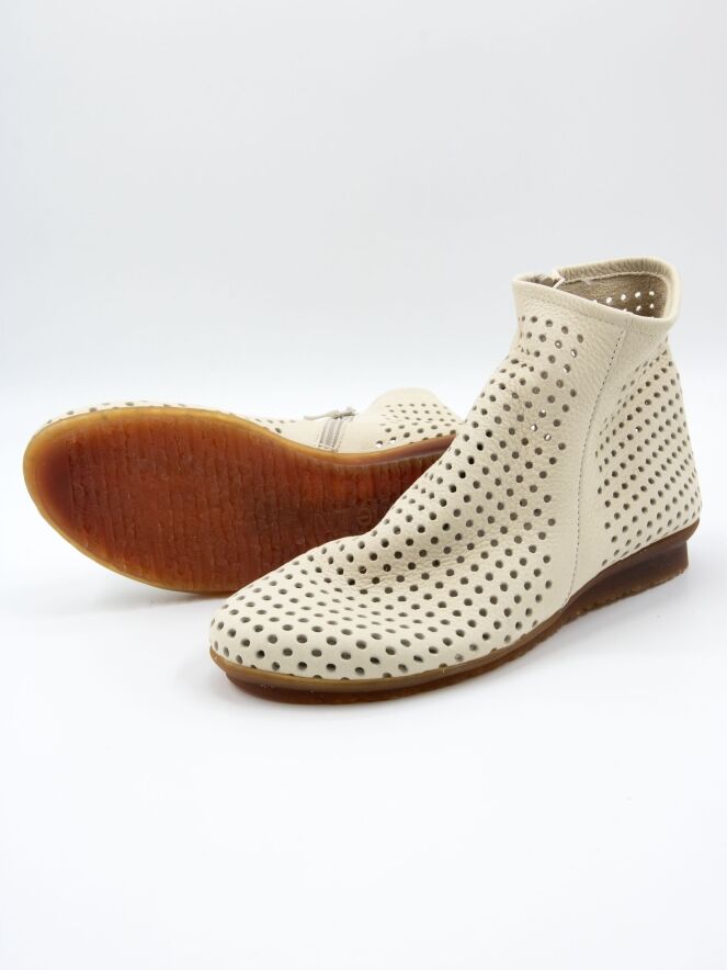 Ein kurzer Stiefel von Arche in Cremeweiß. Das Leder ist fein perforiert. An der Innenseite befindet sich ein Reißverschluss, und der Stiefel hat eine runde Zehenkappe.