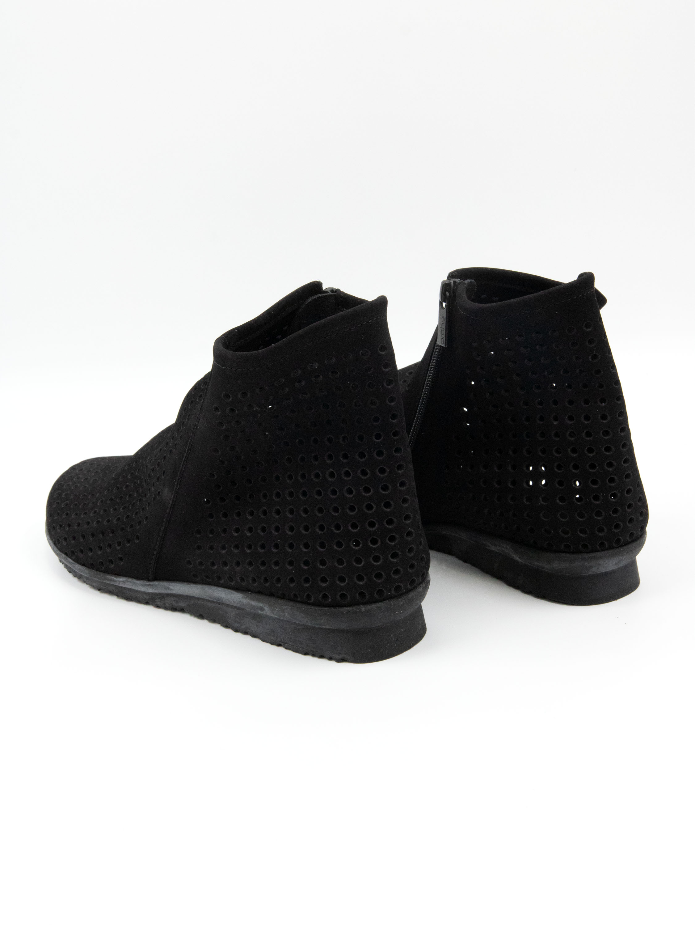 Eine Stiefelette der Schuhmarke Arche in Schwarz. Das Nubuk-Wildleder leicht perforiert. Auf der Innenseite befindet sich ein Reißverschluss. Die Stiefelette ist vorn abgerundet.