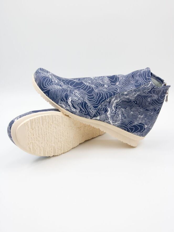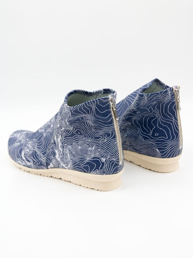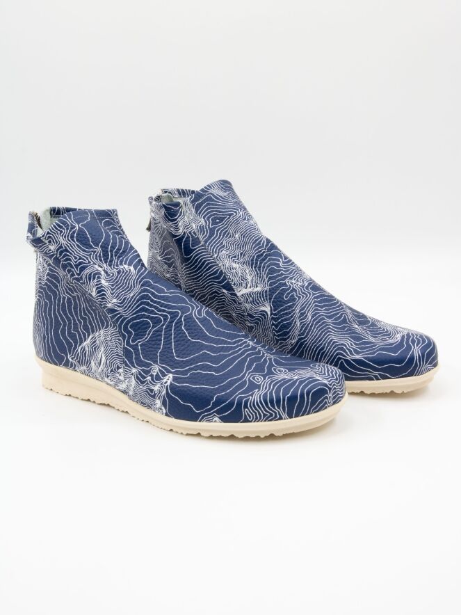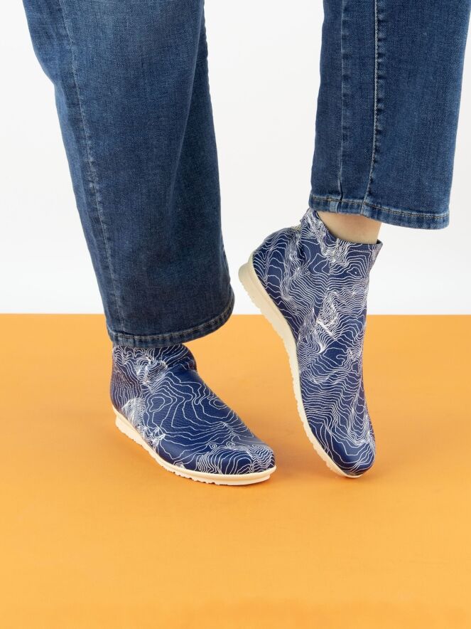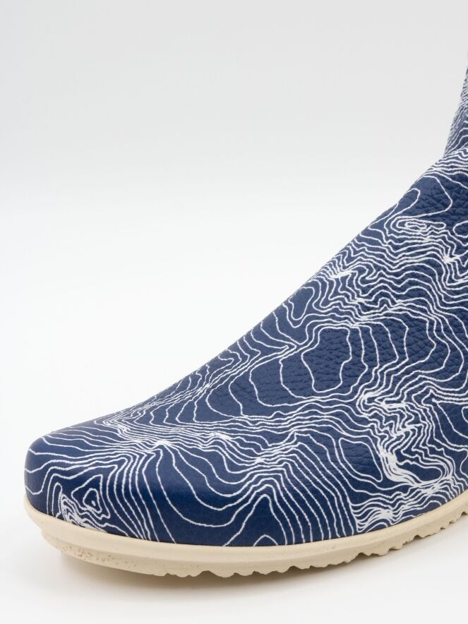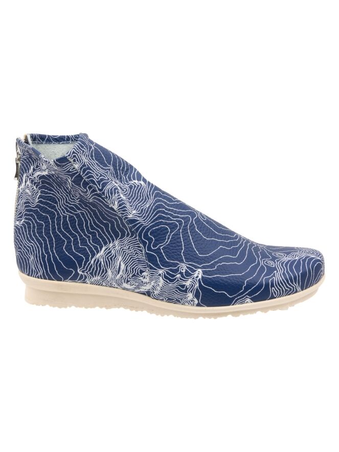 Ein kurzes Stiefeletten von Arche mit einem grafischen Muster aus weißen Linien auf blauem Hintergrund. Der Reißverschluss befindet sich an der Ferse. Das Stiefeletten besteht aus sehr weichem Leder mit leichtem Glanz und ist innen ungefüttert. Die Latexsohle hat eine leichte Erhöhung an der Rückseite, die den Tragekomfort zusätzlich erhöht.
