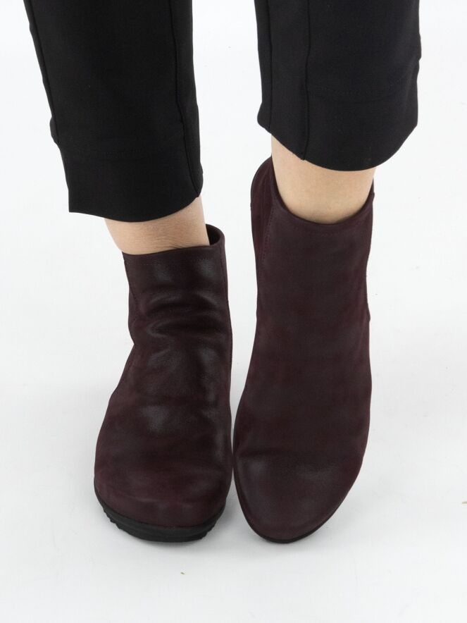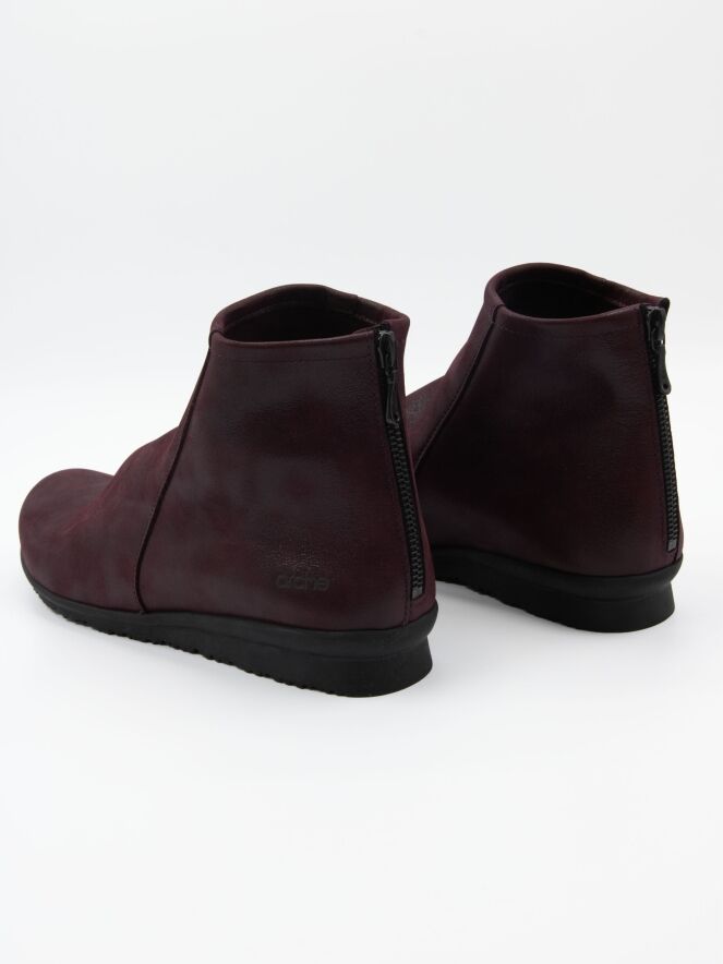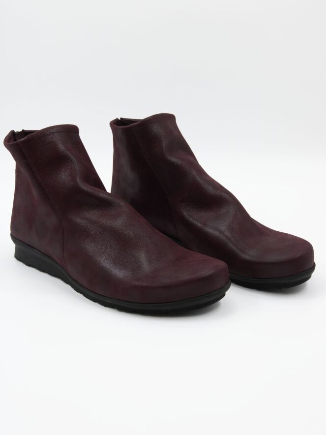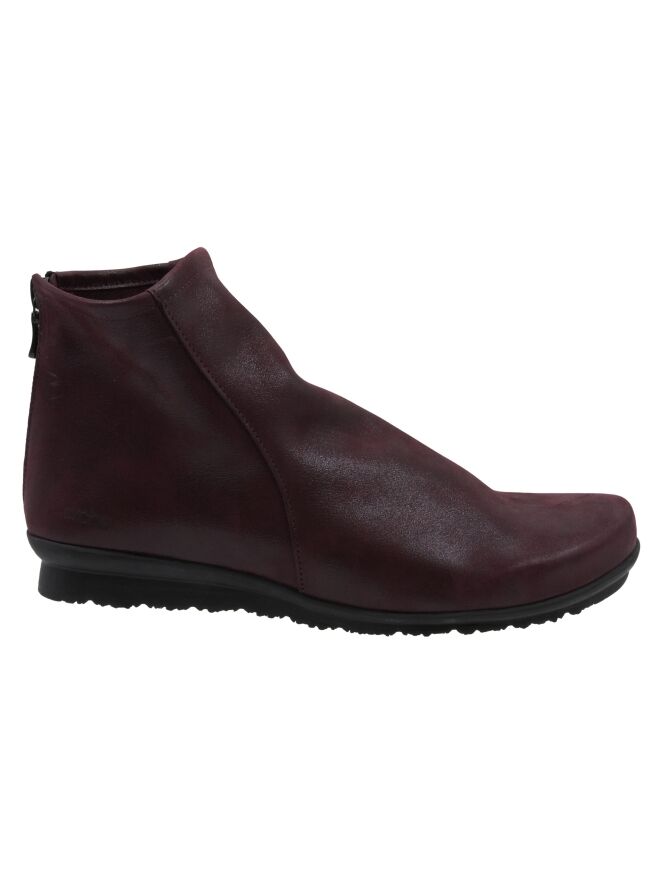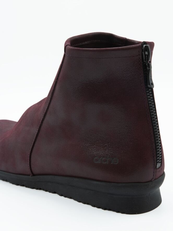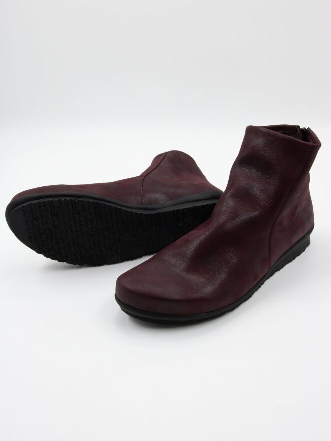Ein kurzer Stiefel der Marke Arche in Bordeauxrot mit einem Reißverschluss an der Ferse. Der Stiefel ist aus sehr weichem Leder gefertigt, das leicht glänzt und innen ungefüttert ist. Die Sohle ist aus Latex mit einer leichten Erhöhung an der Rückseite, was den Tragekomfort zusätzlich erhöht.