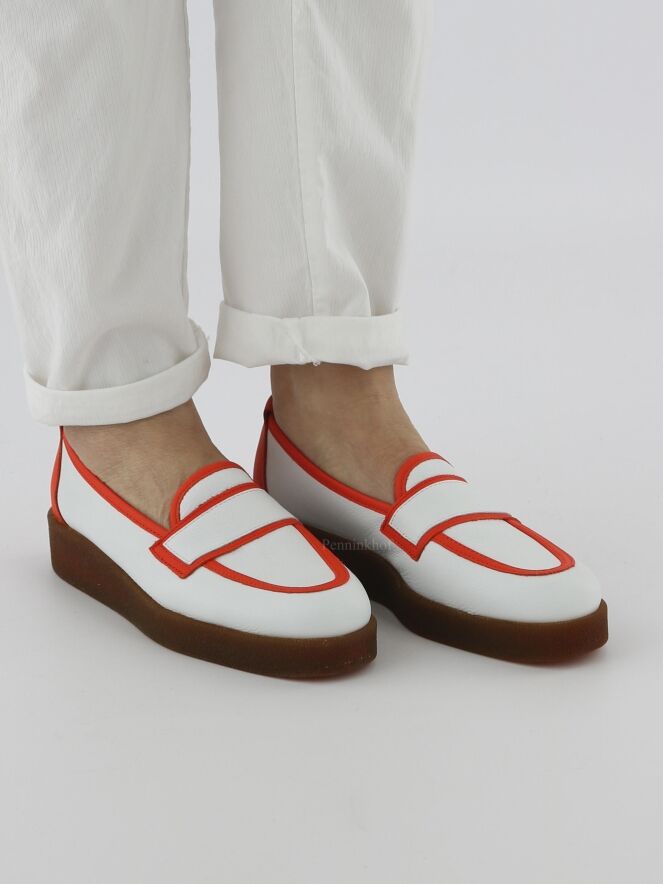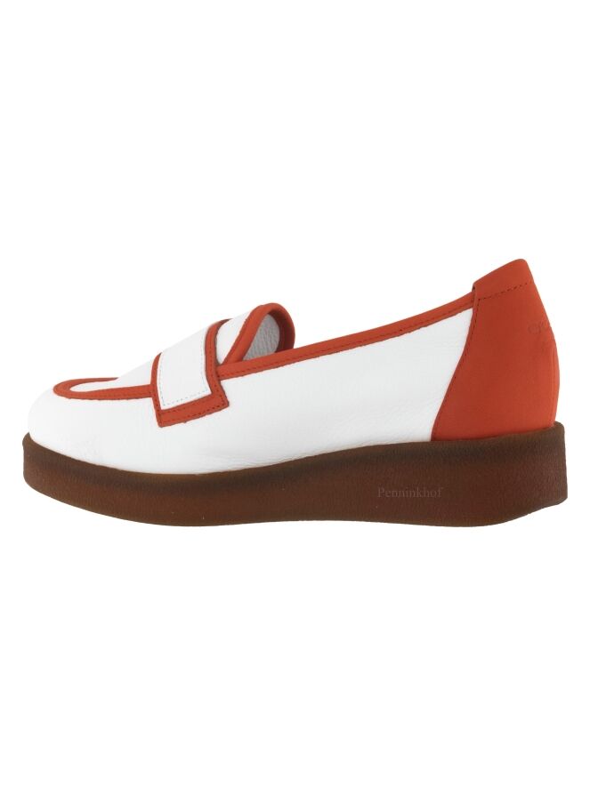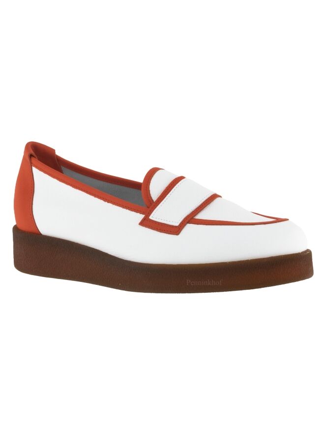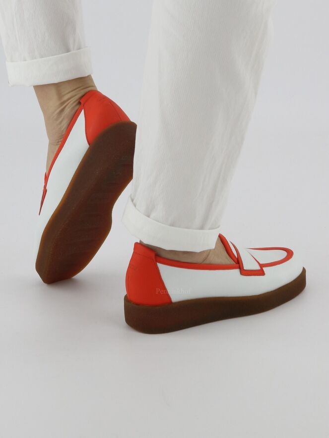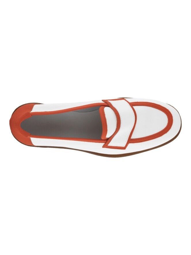 Ein weißer Slipper der Schuhmarke Arche. Auf dem vorderen Fußteil und entlang der Schaftkante befindet sich ein orangefarbener Lederbesatz. Der Absatz ist aus orangefarbenem Leder.