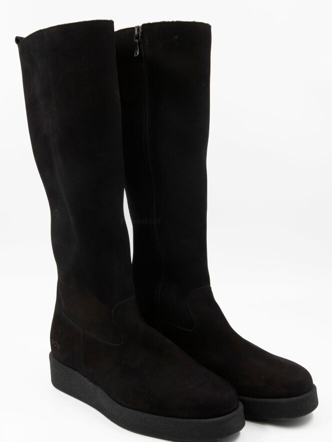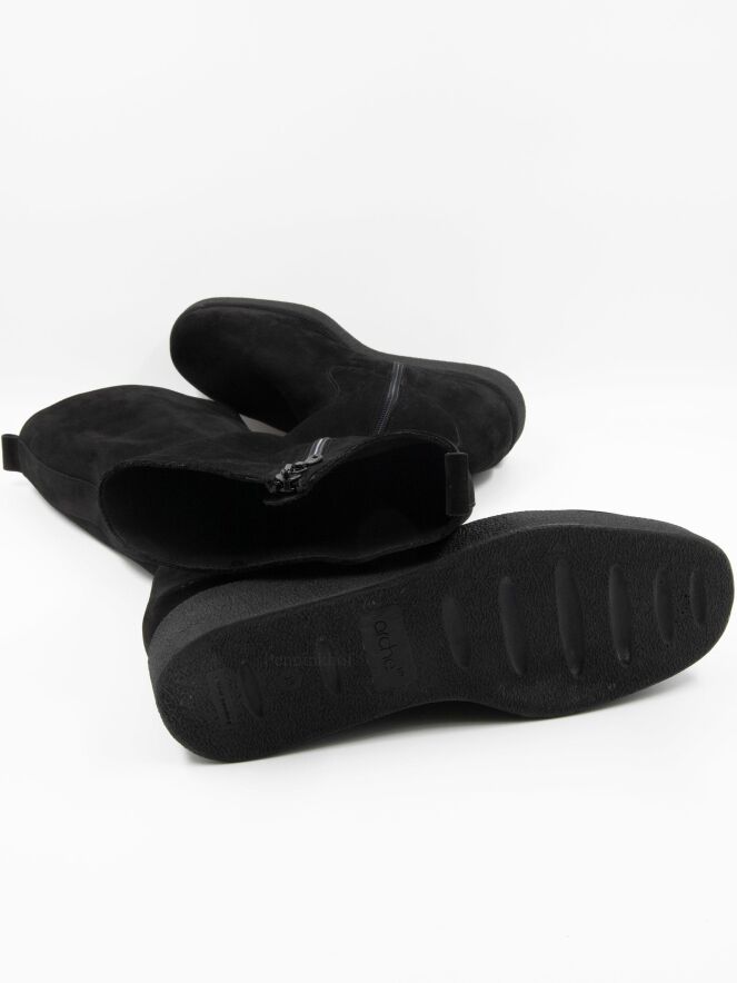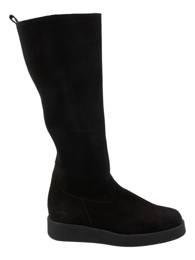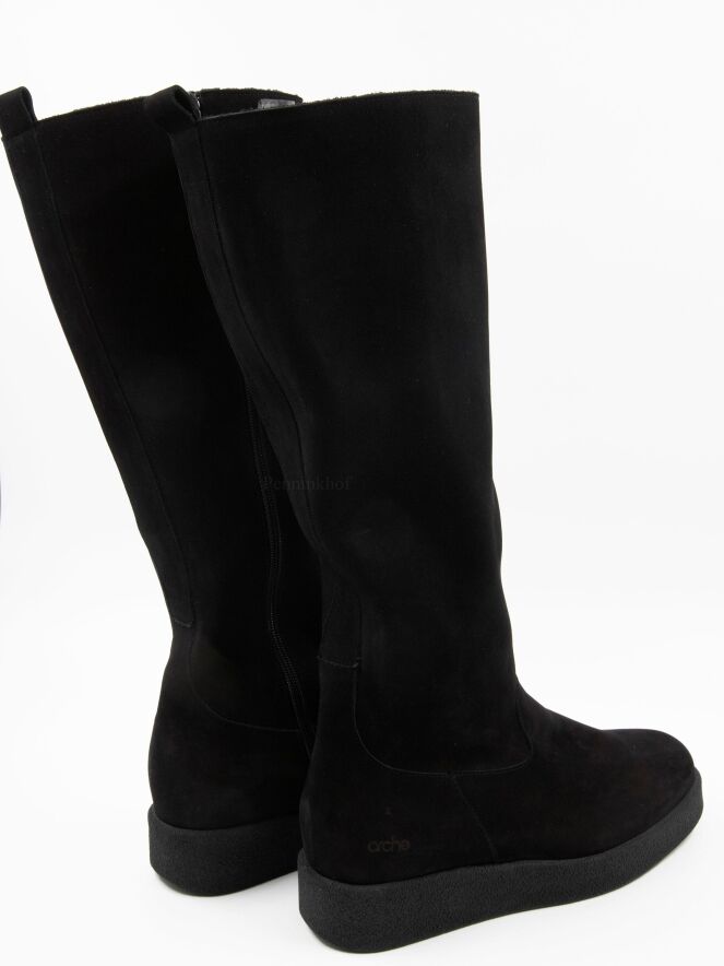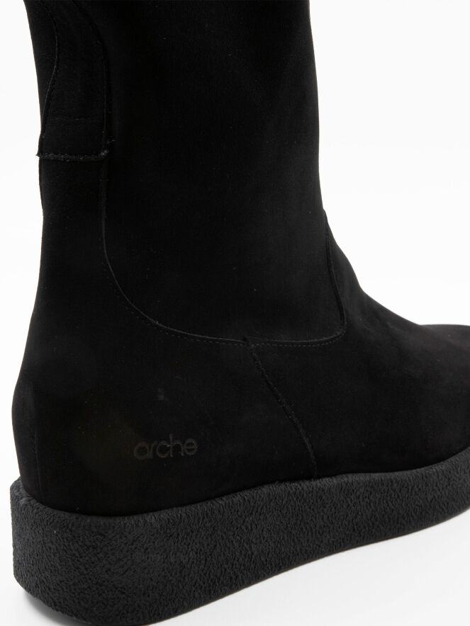 Ein hoher Stiefel von Arche in schwarzer Farbe. Auf der Innenseite des Schafts befindet sich ein Reißverschluss. Die Sohle ist schwarz. Das Innere ist ungefüttert.