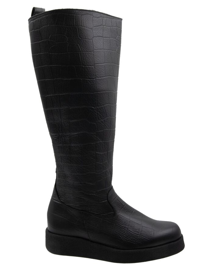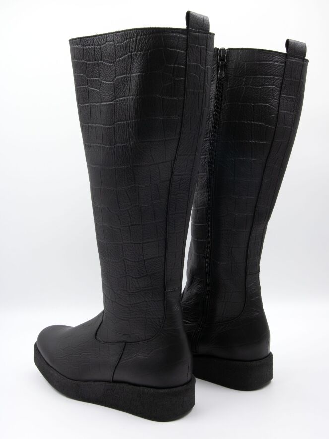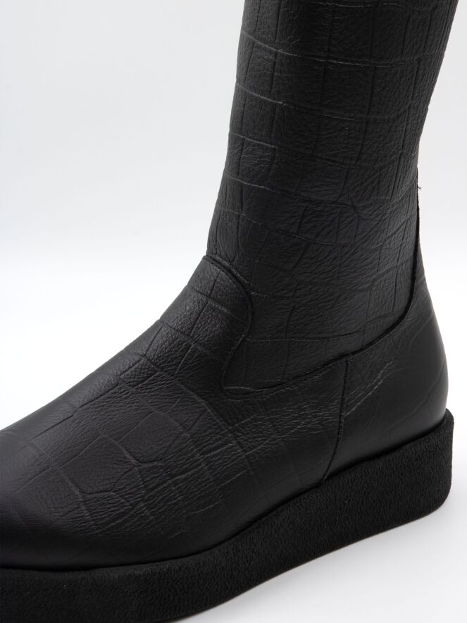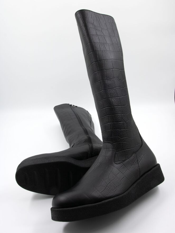 Ein hoher Stiefel von Arche in Schwarz. Das Leder ist mit einem unregelmäßigen Karomuster geprägt. An der Innenseite befindet sich ein Reißverschluss über die gesamte Länge des Schafts. Der Vorfuß hat eine runde Nase und der Schaft ist ungefüttert. Der Stiefel hat eine Latex-Speck-Sohle.
