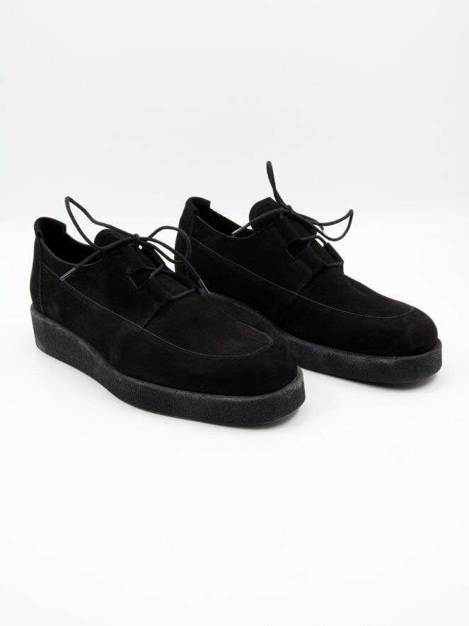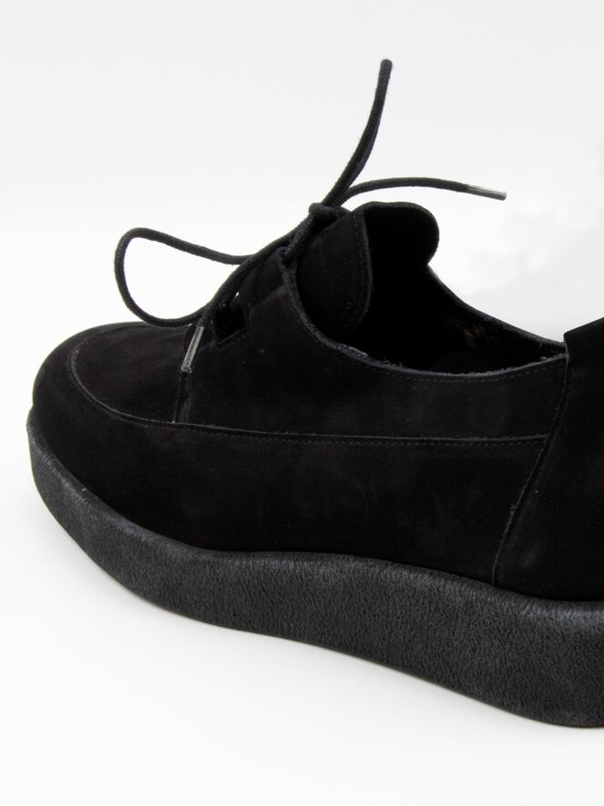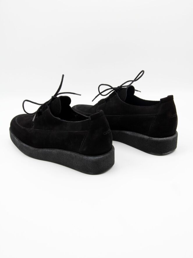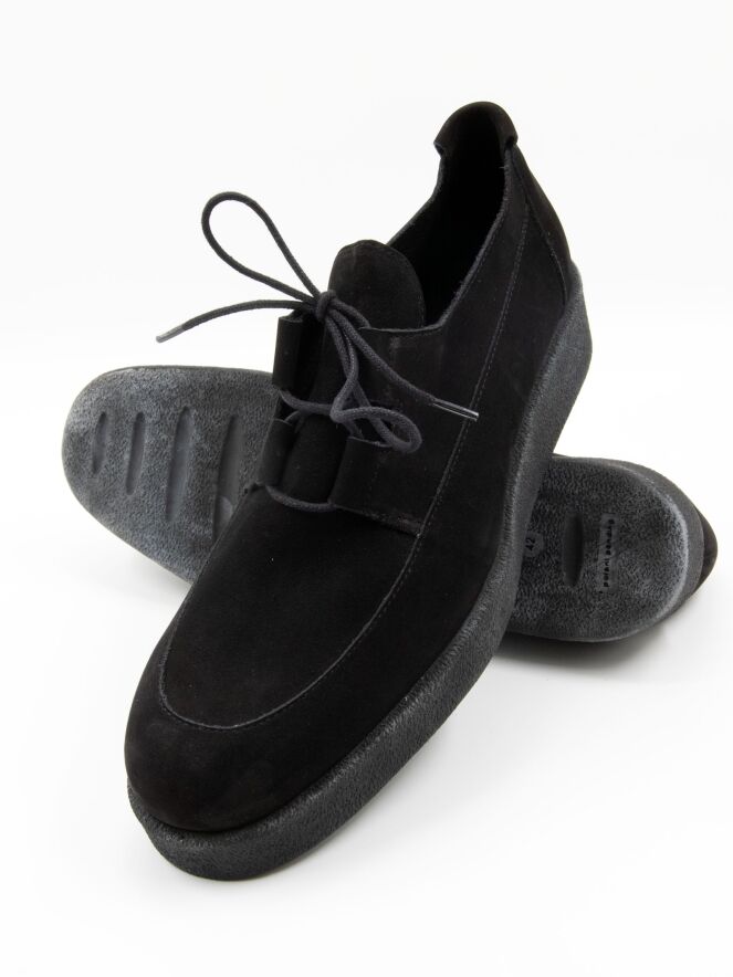 Ein Schnürschuh von Arche in Schwarz. Der Schuh hat vier breite Schnürschlaufen und eine schwarze Plateausohle. Das Innere ist ungefüttert.