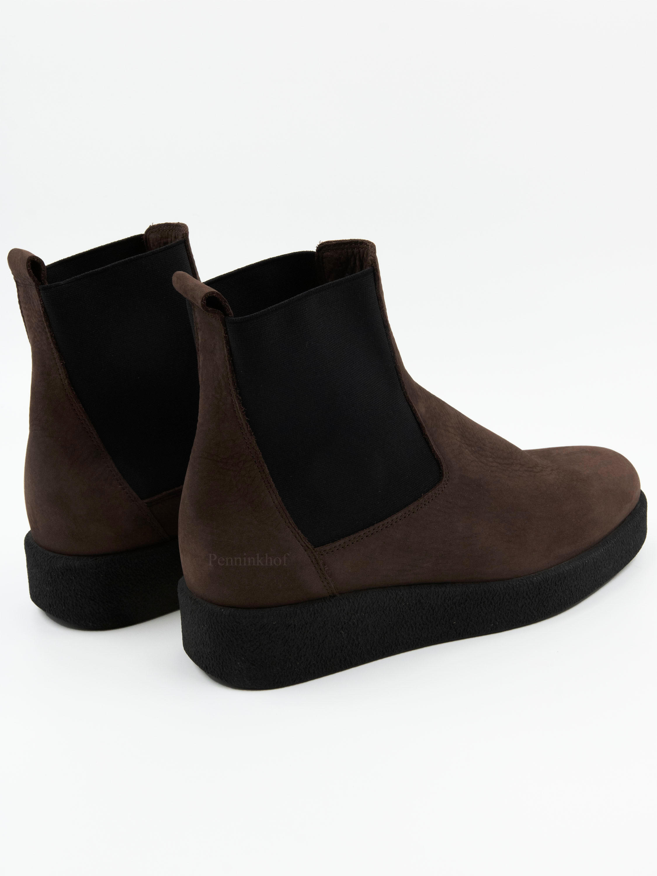 Eine Stiefelette der Schuhmarke Arche in Mokkabraun. Die Stiefelette hat eine leicht erhöhte sportliche Latexsohle in Schwarz. Auf beiden Seiten des Schaftes befindet sich ein schwarzes elastisches Stück Stoff. Der Schuh hat kein Innenfutter.