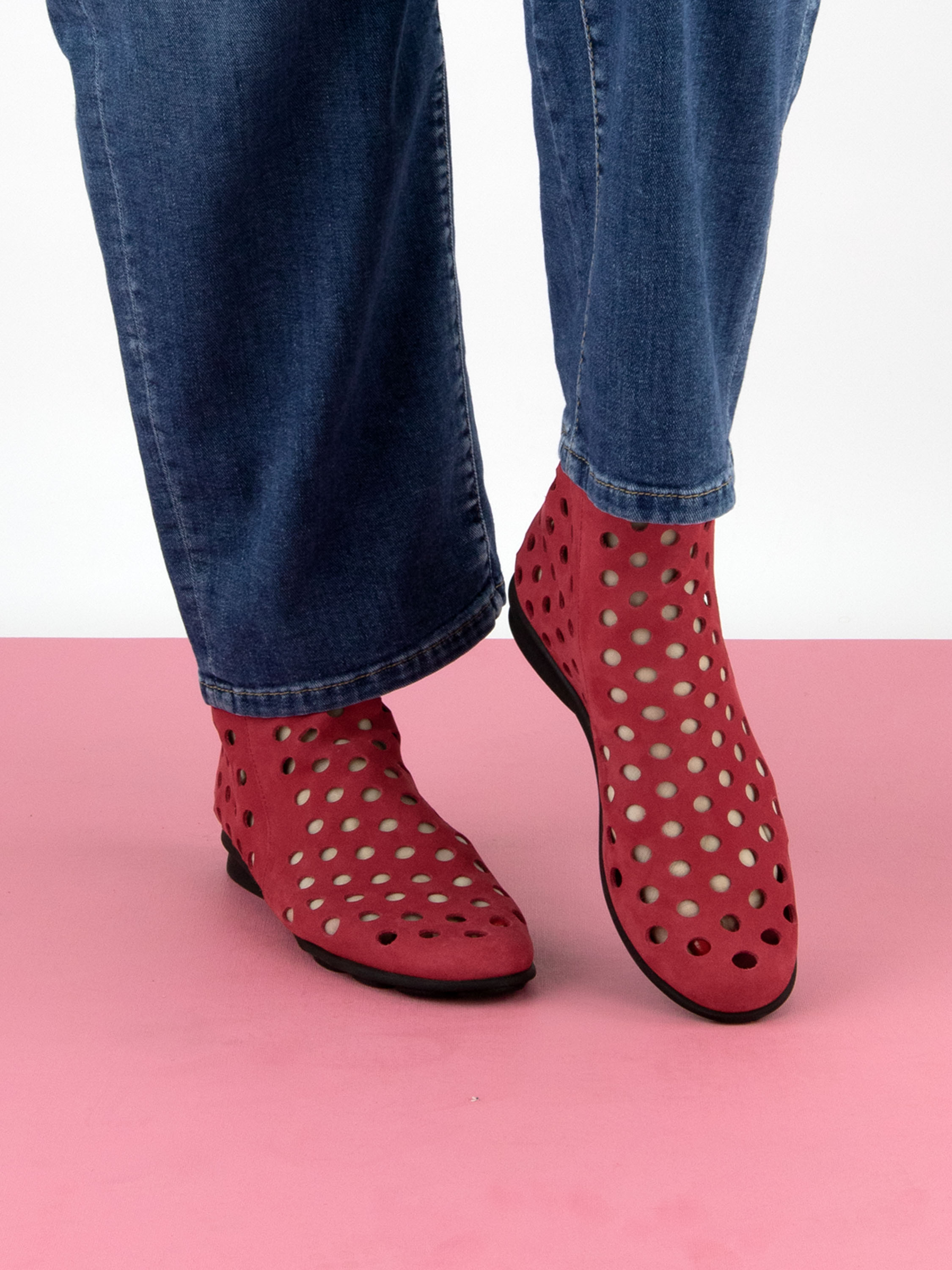 Ein kurzer, perforierter Slipper-Stiefel von Arche in Himbeerrot. Das Leder ist sehr weich, und an der Rückseite des Stiefels befindet sich ein Reißverschluss. Die Sohle besteht aus schwarzem Latex, und das Innere ist ungefüttert.