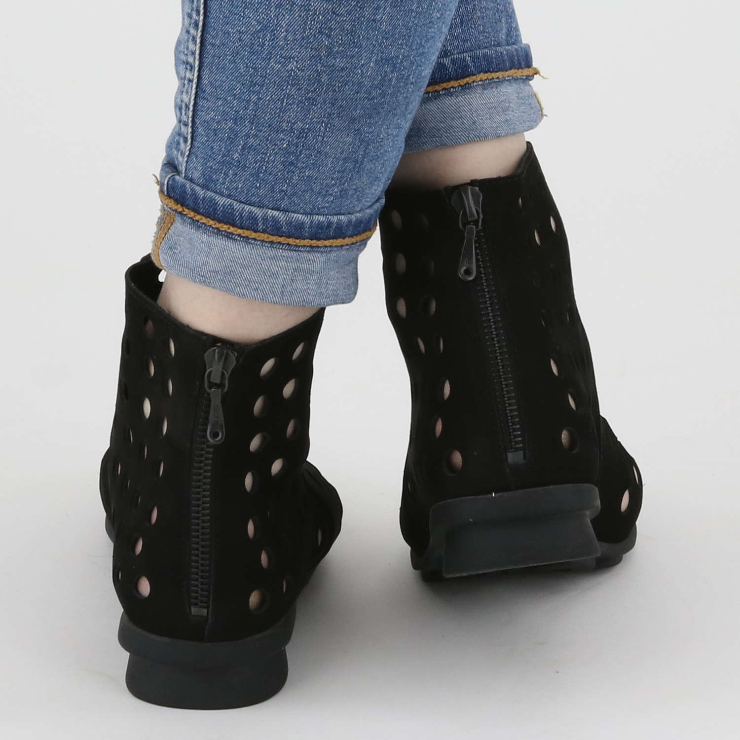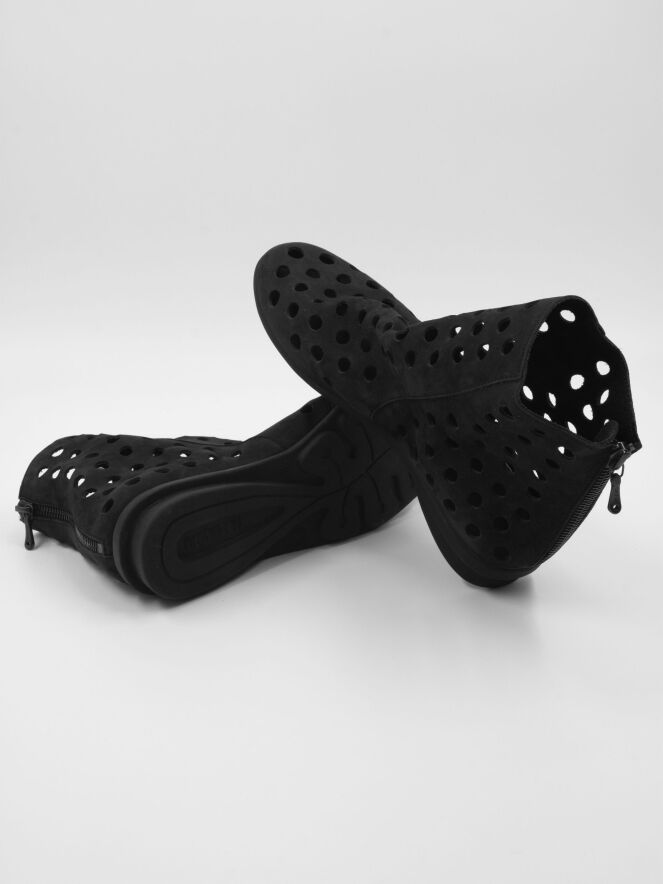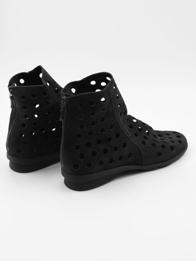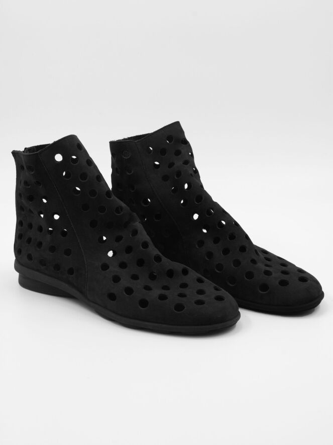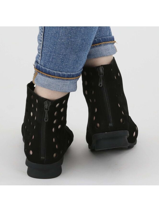 Eine kurze perforierte Stiefelette der Schuhmarke Arche in Schwarz. Das Nubukleder ist sehr geschmeidig. Auf der Rückseite der Stiefelette befindet sich ein Reißverschluss. Die Sohle ist aus schwarzem Latex. Die Stiefelette hat kein Innenfutter.