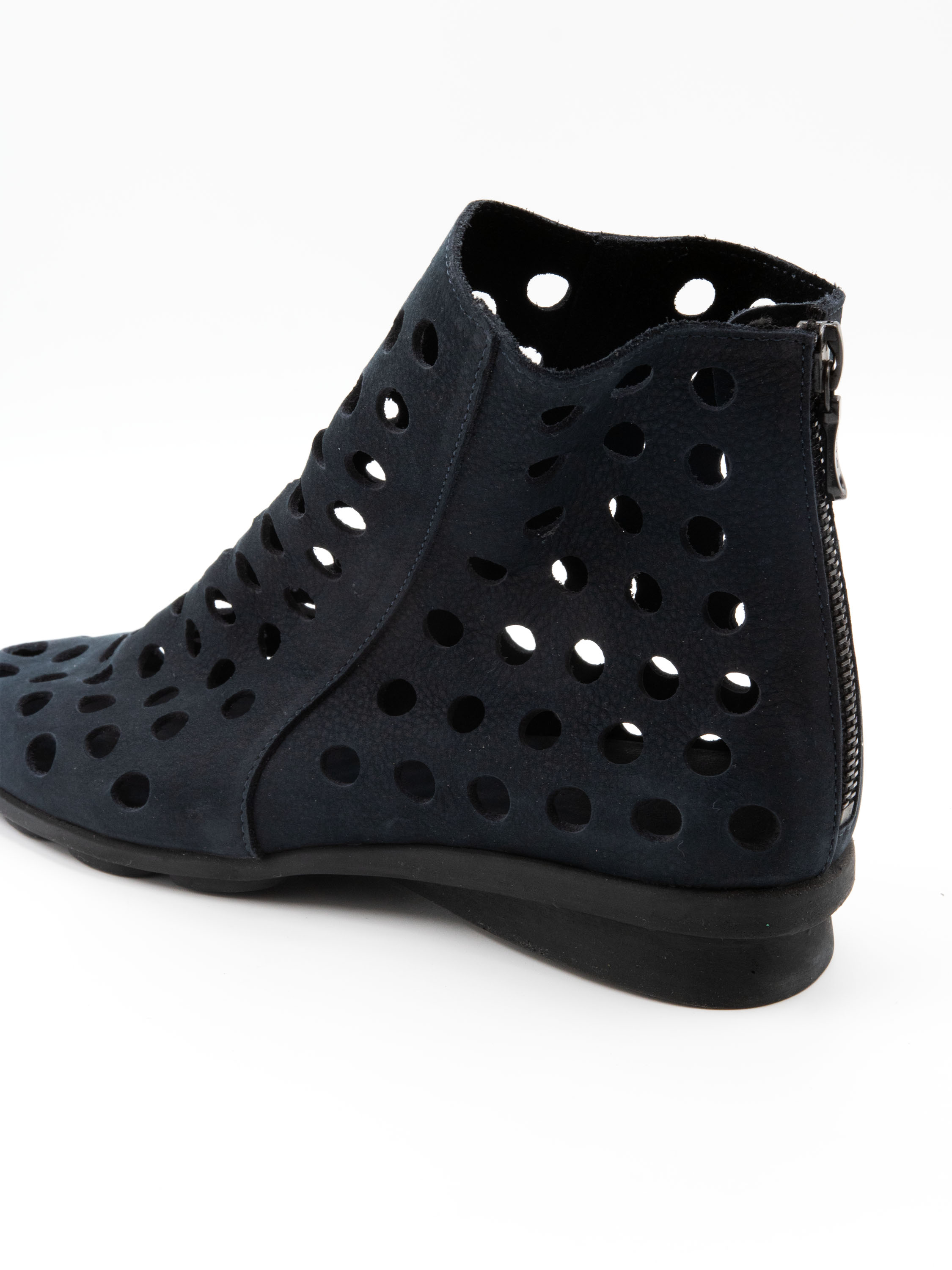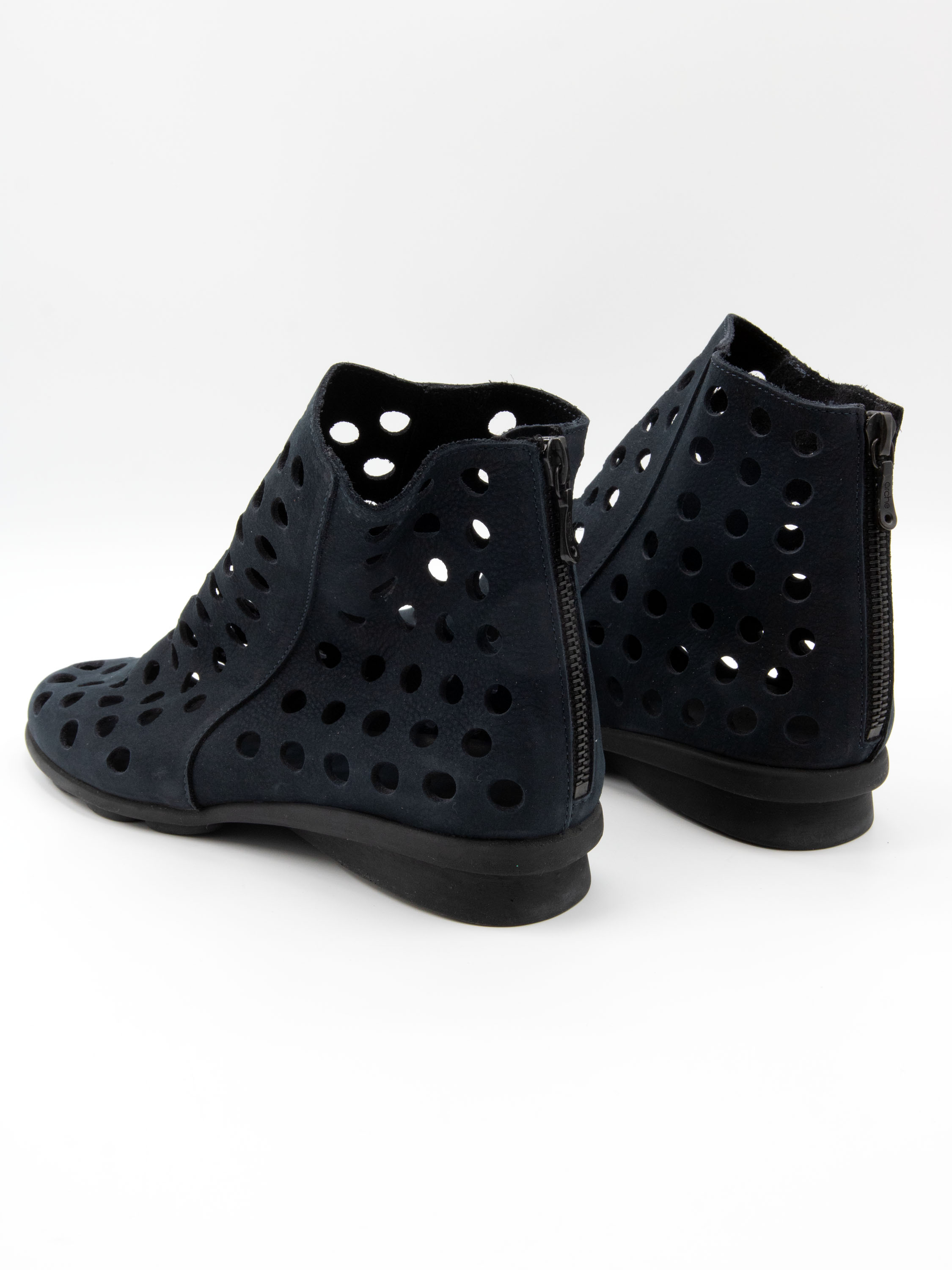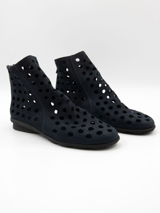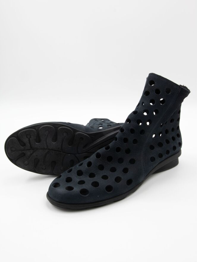 Kurzer, perforierter Schlupfstiefel von Arche in einem eleganten Marineblau. Das besonders weiche Leder garantiert höchsten Tragekomfort. Ein Reißverschluss an der Rückseite erleichtert das Anziehen. Die schwarze Latexsohle sorgt für Flexibilität und Dämpfung, während das Modell innen ungefüttert ist und dadurch eine leichte, natürliche Passform bietet.