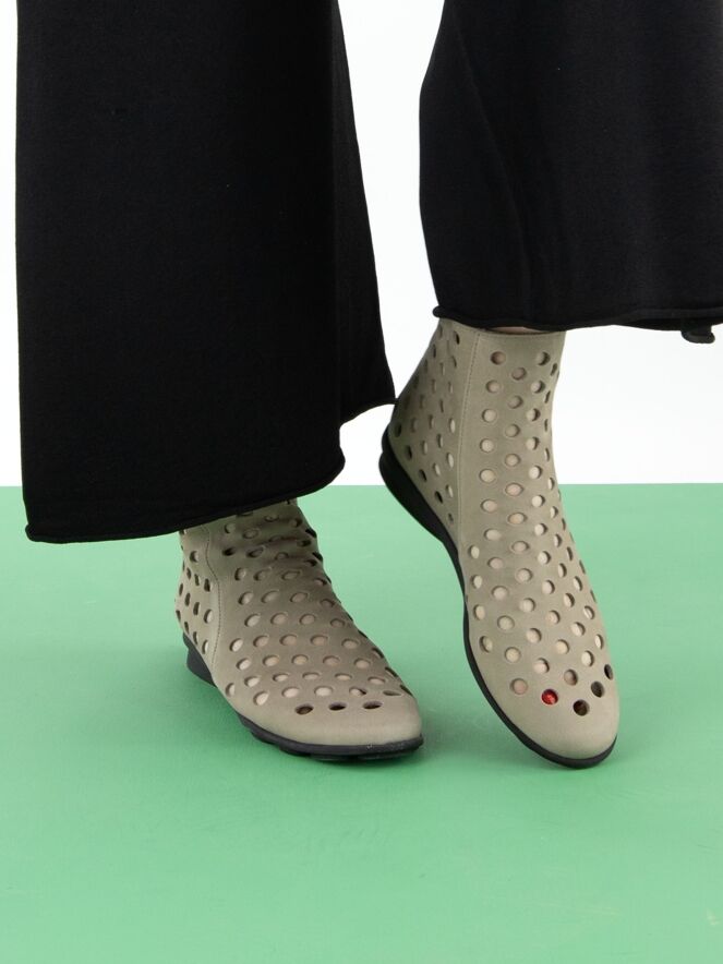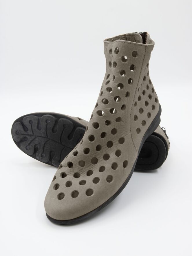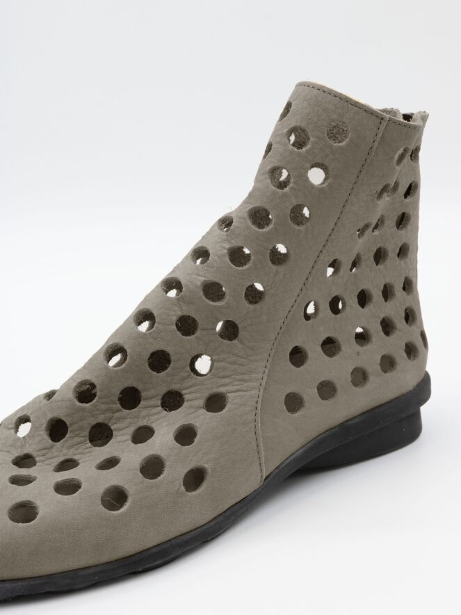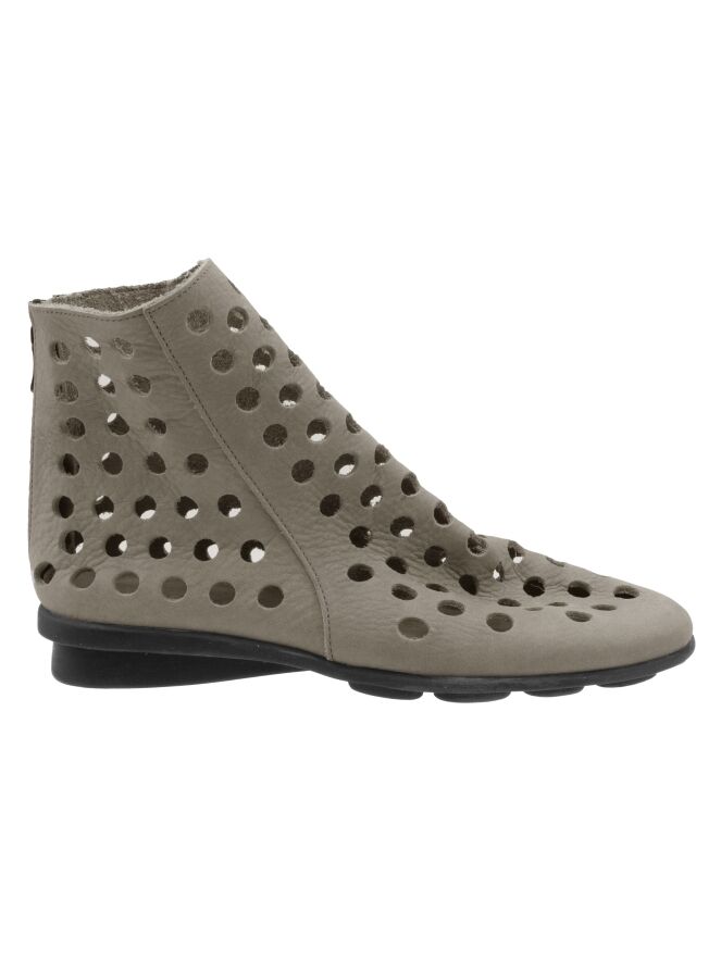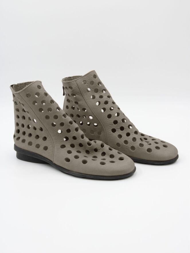 Ein kurzer perforierter Schlupfstiefel von Arche in Grau. Das Leder ist besonders weich, und an der Rückseite des Stiefels ist ein Reißverschluss eingesetzt. Die Sohle besteht aus schwarzem Latex, und das Innere ist ungefüttert für zusätzliche Flexibilität und Komfort.
