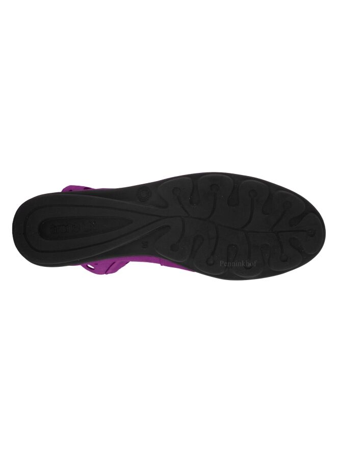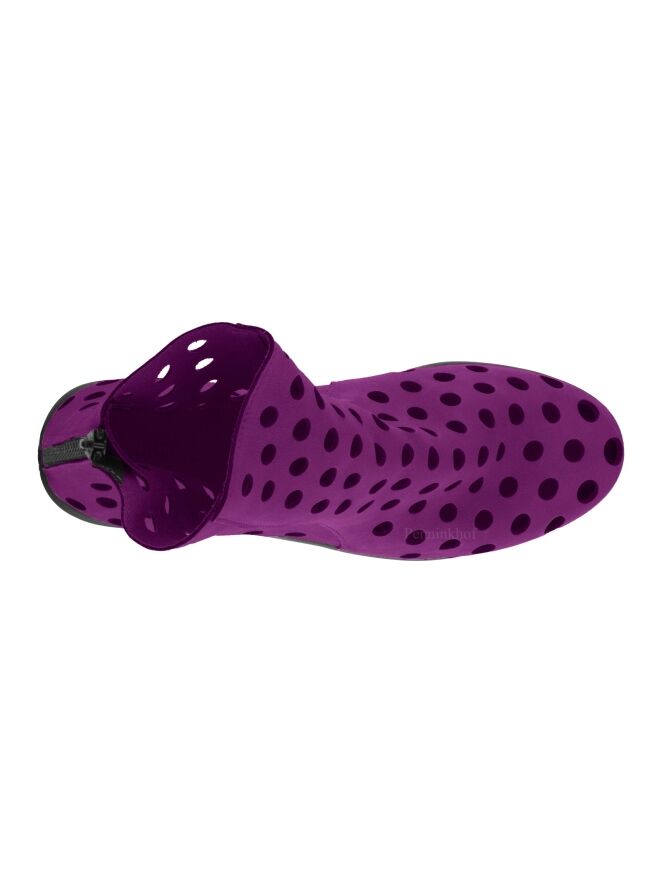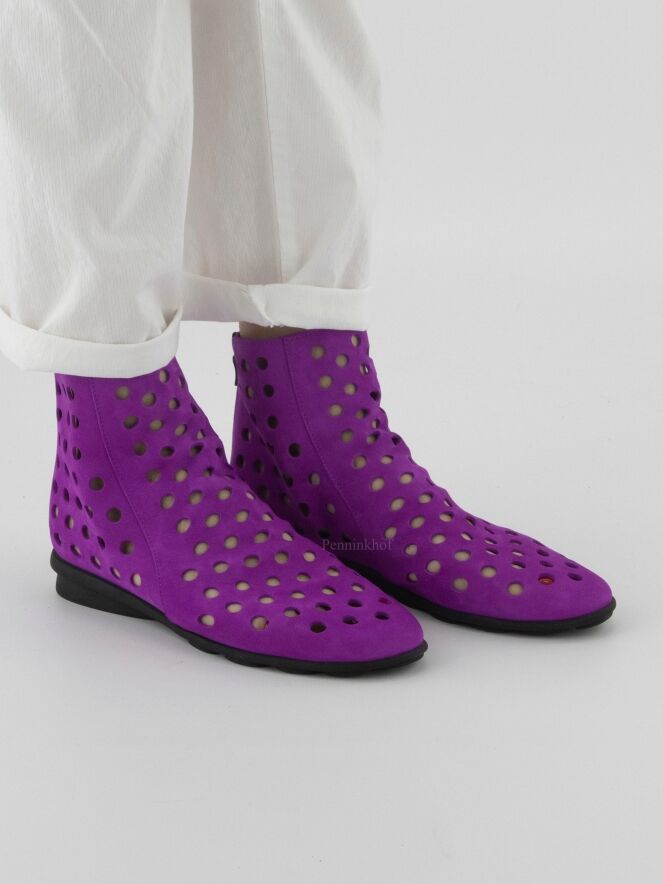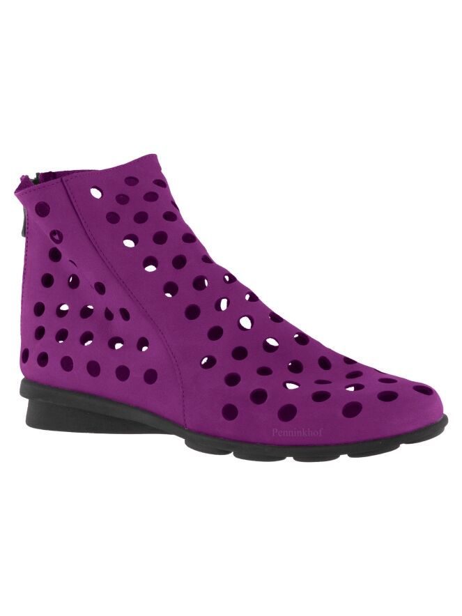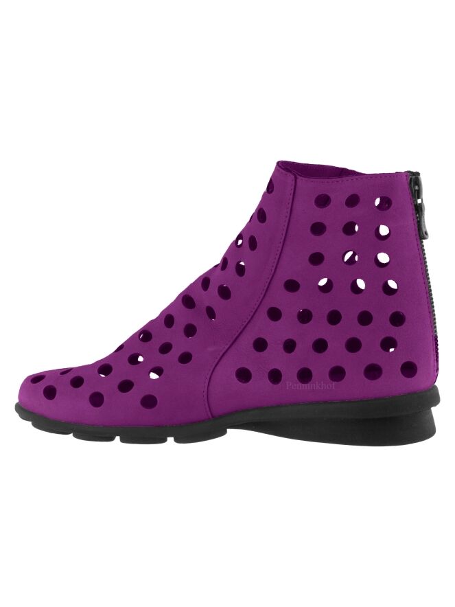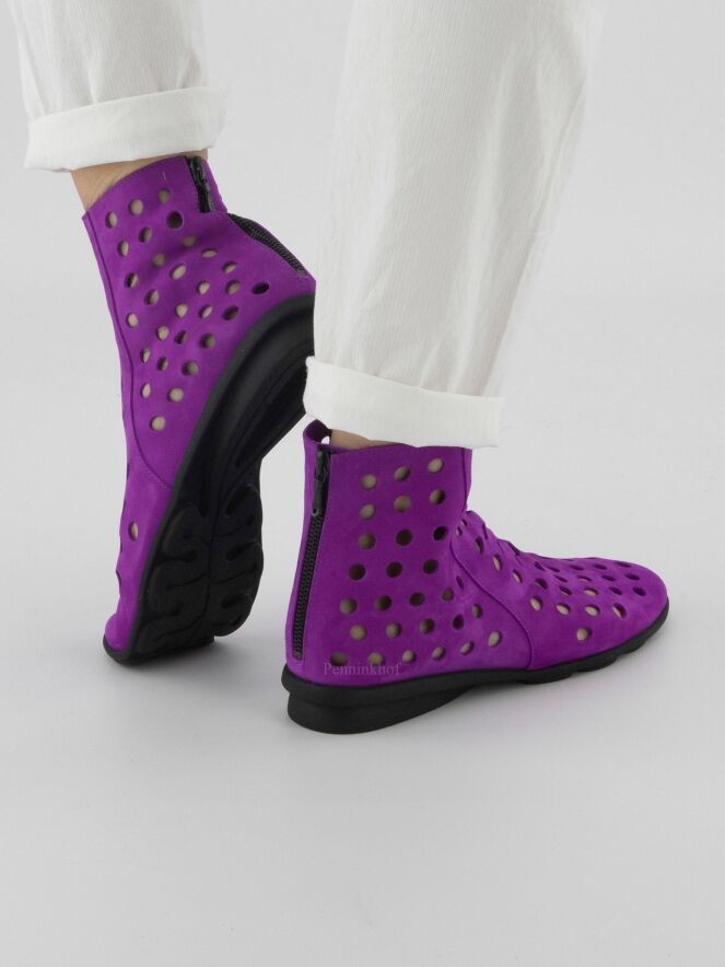 Eine kurze perforierte Stiefelette der Schuhmarke Arche in Violett. Das Nubukleder ist sehr geschmeidig. Auf der Rückseite der Stiefelette befindet sich ein Reißverschluss. Die Sohle ist aus schwarzem Latex. Die Stiefelette hat kein Innenfutter.
