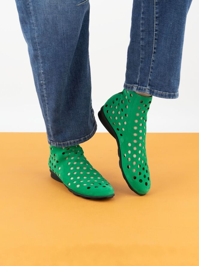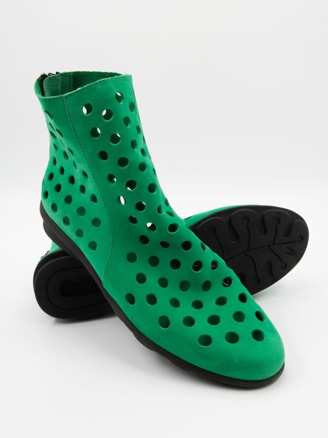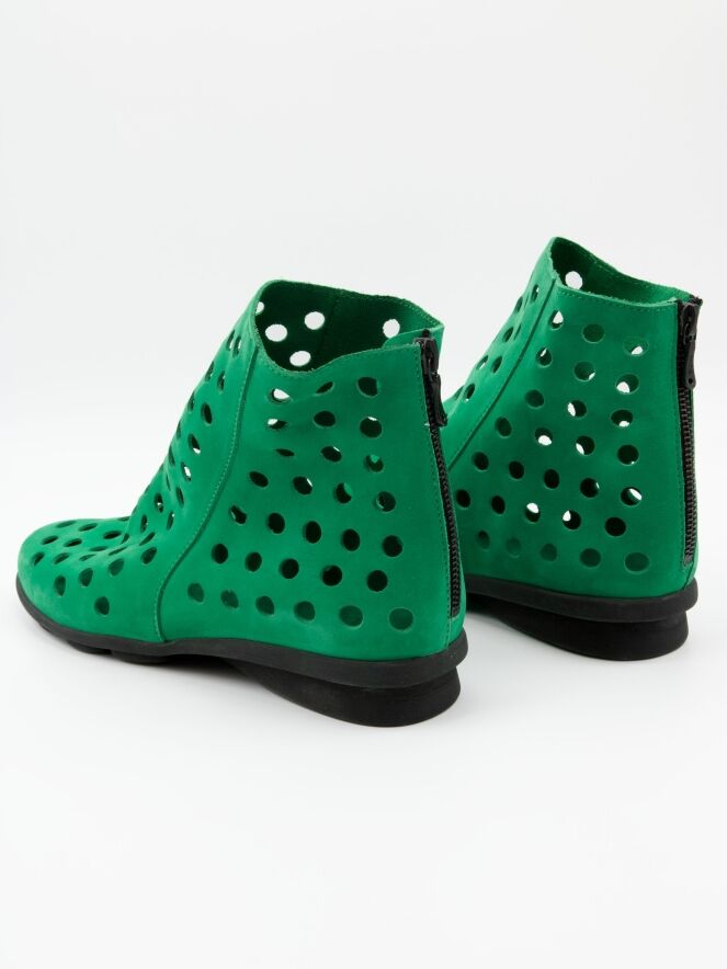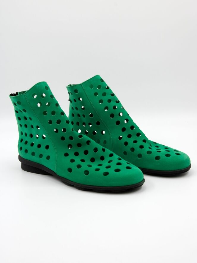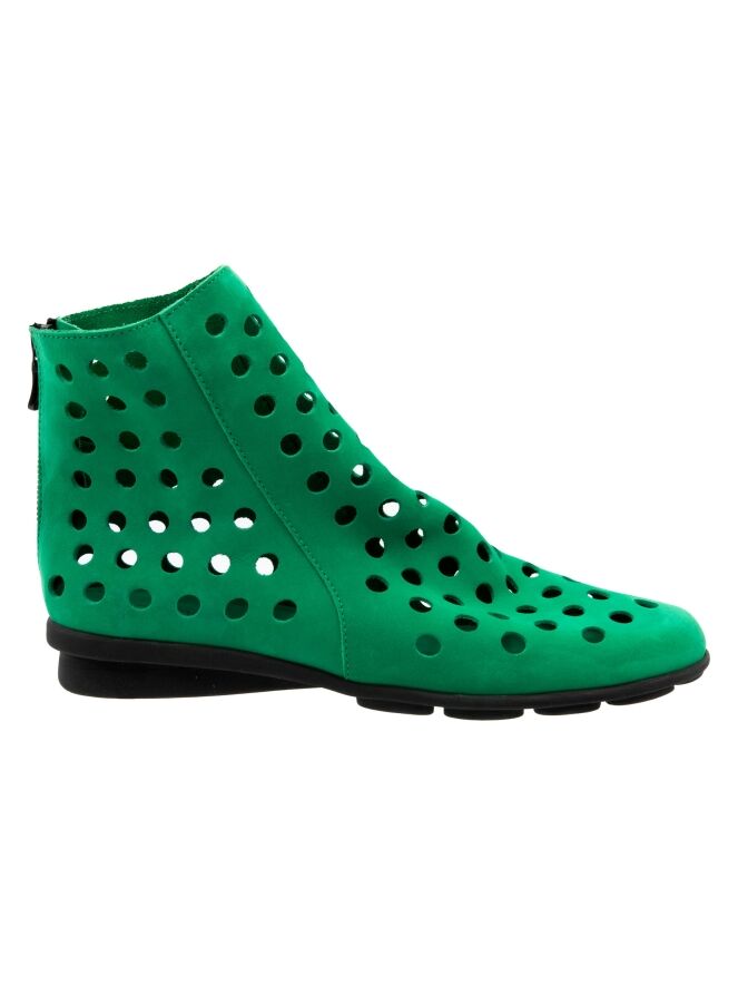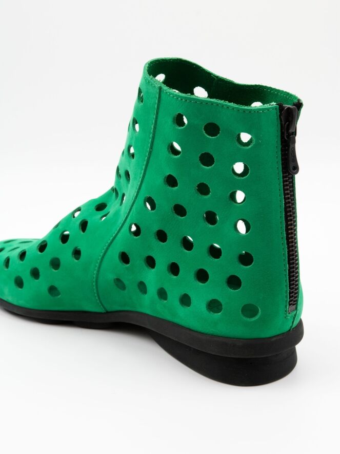 Ein kurzer perforierter Schlupfstiefel von Arche in Smaragdgrün. Das Nubukleder ist besonders weich, und an der Rückseite des Stiefels ist ein Reißverschluss eingesetzt. Die Sohle besteht aus schwarzem Latex, und das Innere ist ungefüttert für zusätzliche Flexibilität und Komfort.