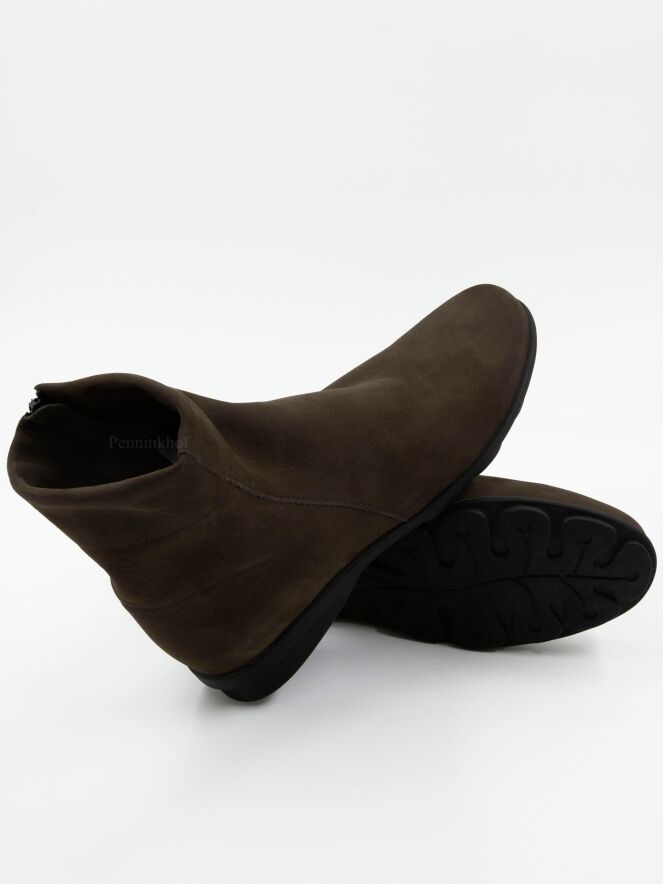 Eine kurze Stiefelette in der Farbe mokkabraun. Der Stiefel hat eine runde Nase und einen Reißverschluss an der Innenseite des Schafts. Die Latexsohle ist an der Ferse leicht hochgezogen. Die Innenseite ist ungefüttert.