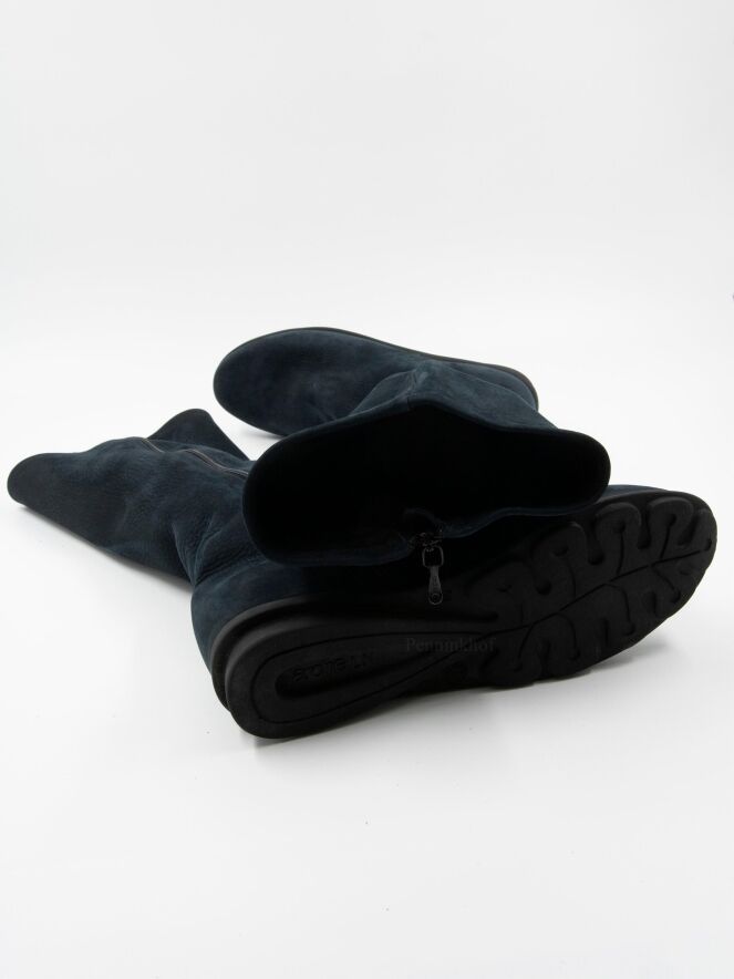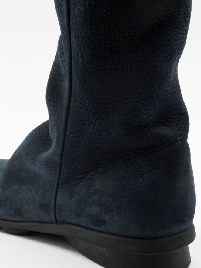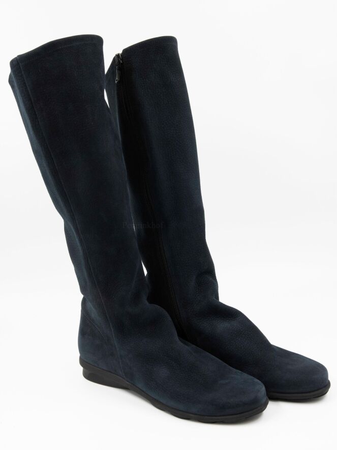 Ein Stiefel der Schuhmarke Arche in Marineblau. Auf der Innenseite verläuft ein schwarzer Reißverschluss über die gesamte Schaftlänge. Die Innenseite des Schaftes ist ungefüttert.