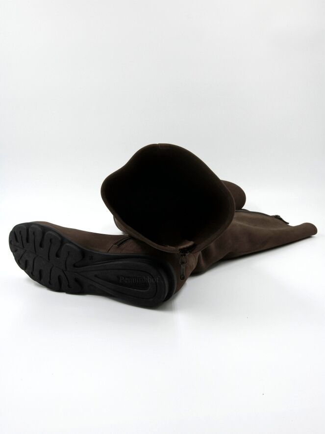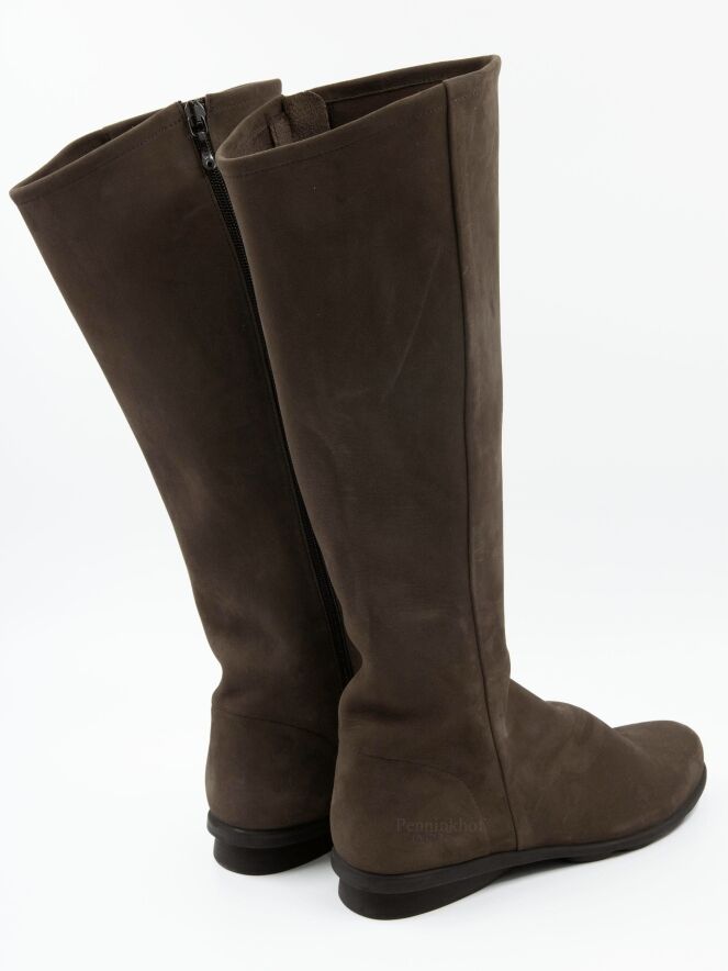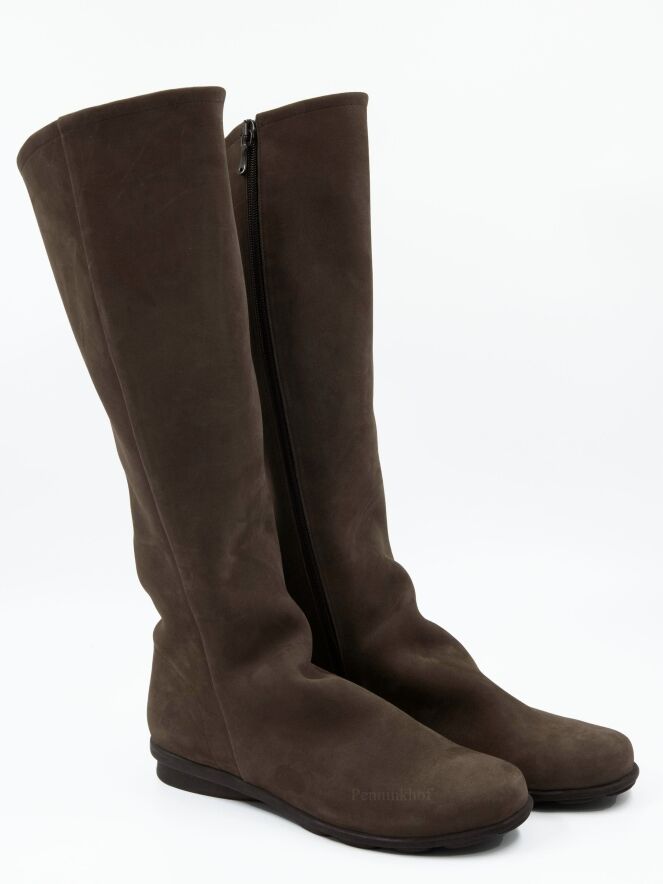Stiefel von Arche in Mokkabraun. Auf der Innenseite des Schafts verläuft ein schwarzer Reißverschluss über die gesamte Länge. Das Innere des Schafts ist ungefüttert.