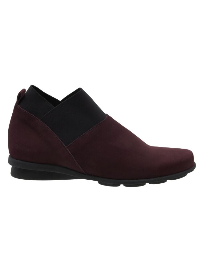 Ein halbschuhe in Burgunderrot mit 2 elastischen schwarzen Bändern entlang des Schaftrandes. Die Latexsohle ist unter der Ferse für besseren Komfort leicht erhöht. Die Innenseite ist ungefüttert.