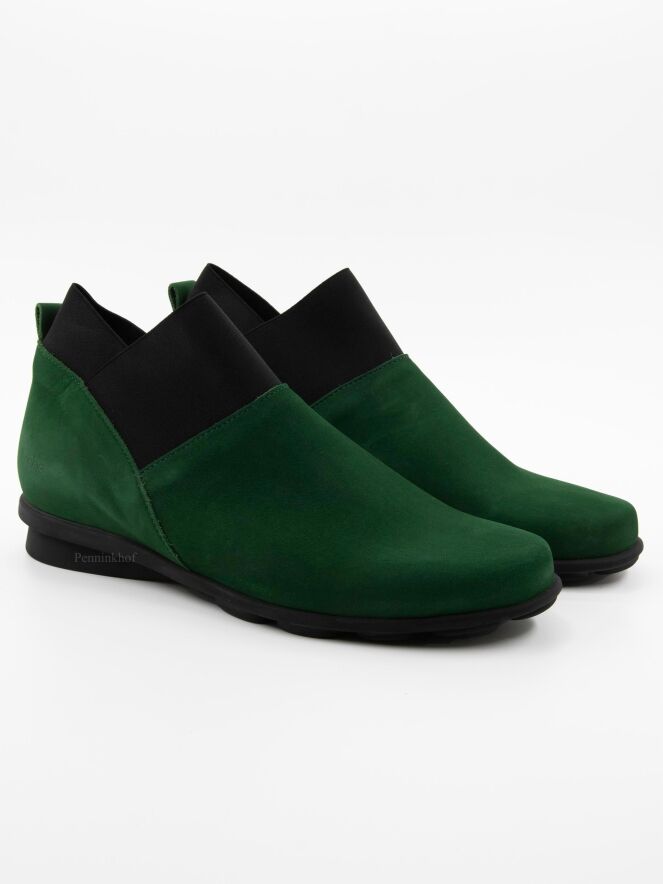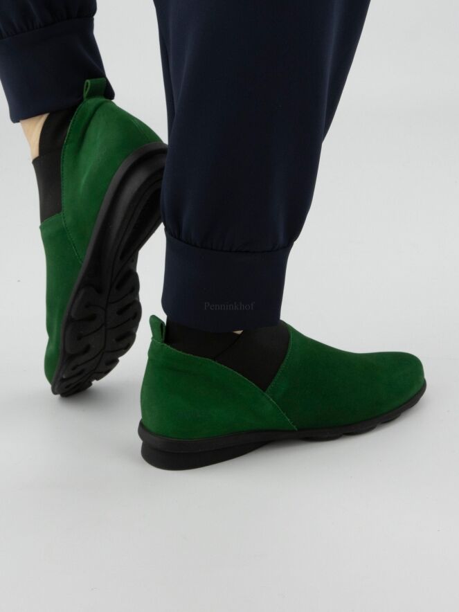 Ein Halbschuh in Grün mit 2 elastischen schwarzen Bändern entlang des Schaftrandes. Die Latexsohle ist unter der Ferse für besseren Komfort leicht erhöht. Die Innenseite ist ungefüttert.