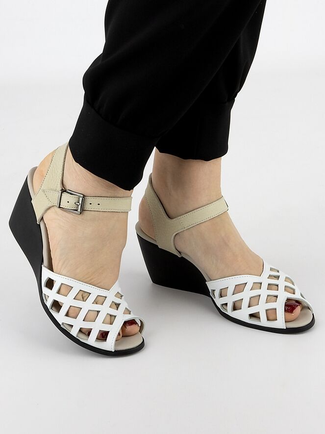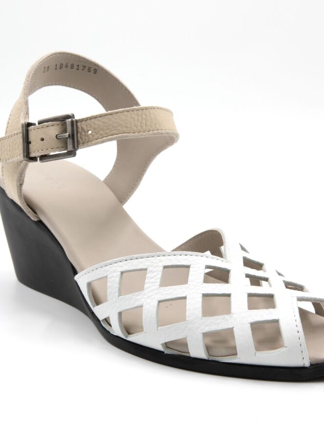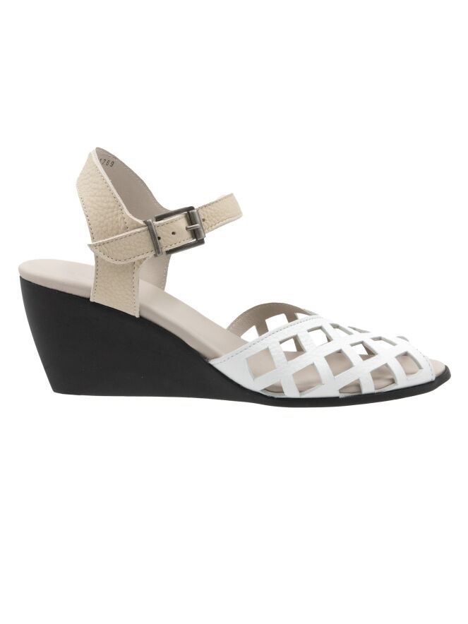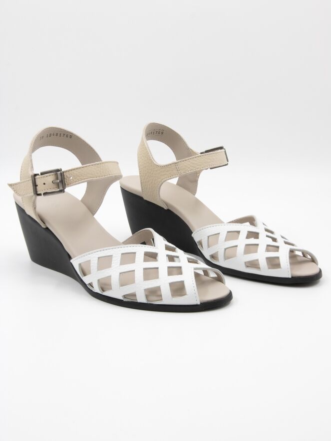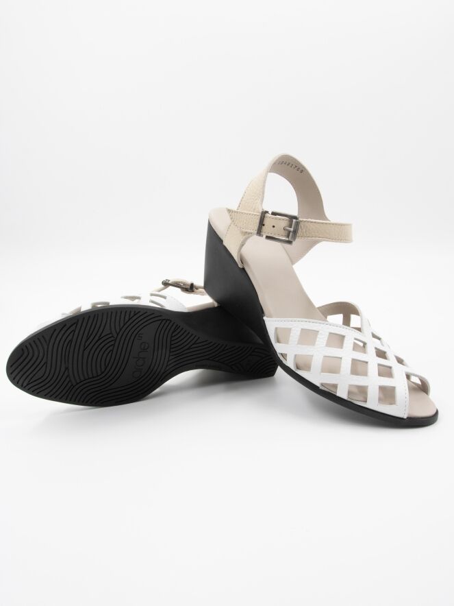 Ein offener Pumps von Arche in Beige mit offenem Leder über dem Vorfuß, das in einem Rautenmuster in der Farbe Cremeweiß geschnitten ist. Der Pumps hat eine offene Zehenpartie und einen Keilabsatz in Schwarz. Der Knöchelriemen ist verstellbar.