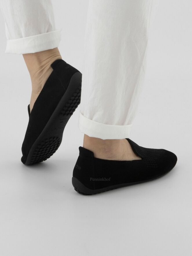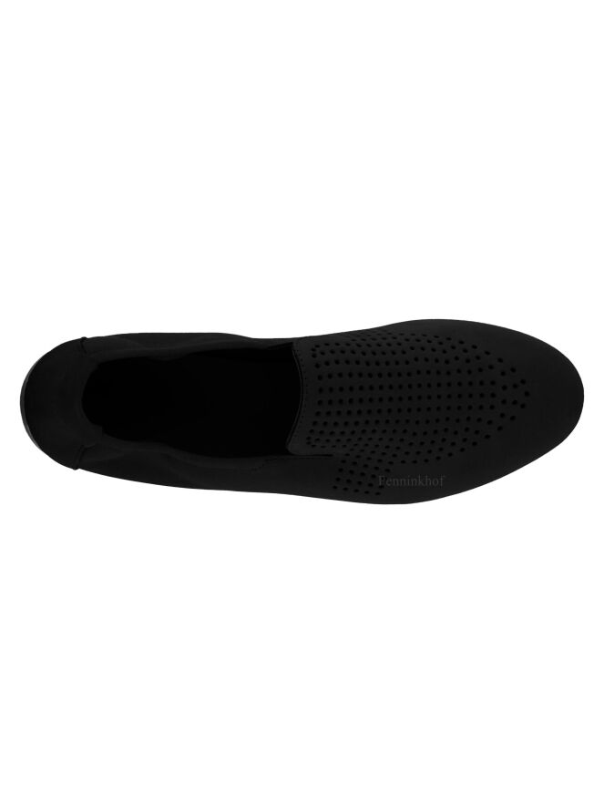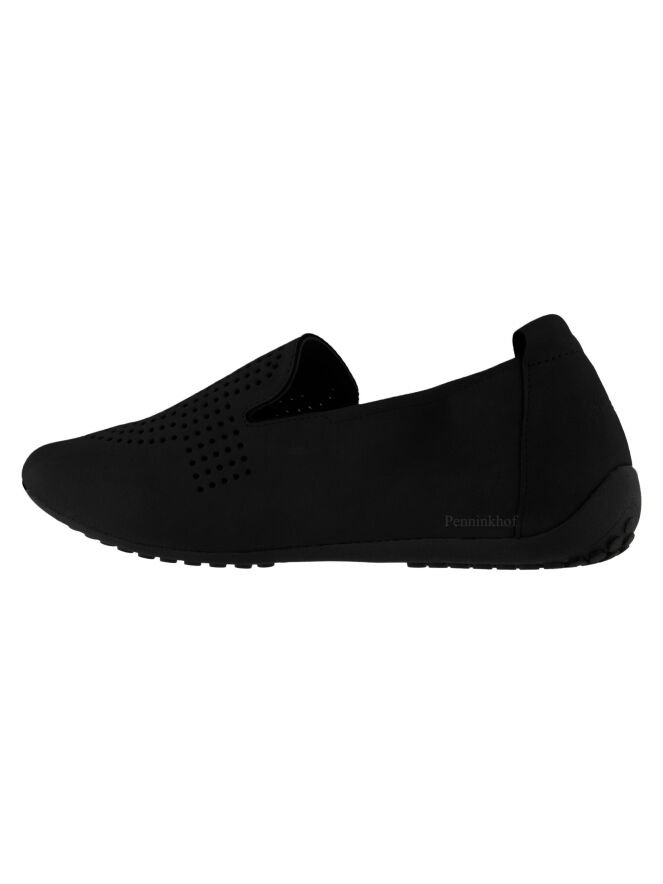 Ein Slipper von Arche in Schwarz. Das Leder im Vorfußbereich ist fein perforiert. Die Sohle ist ebenfalls schwarz. Das Innere ist ungefüttert und sorgt für zusätzliche Geschmeidigkeit und Tragekomfort.