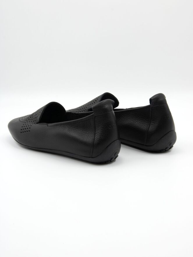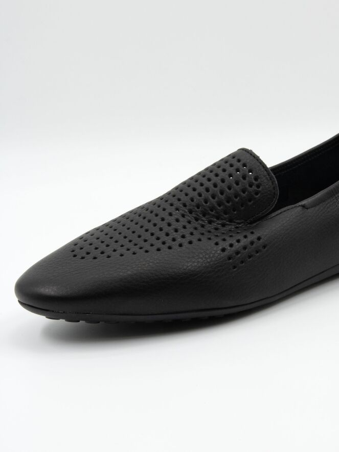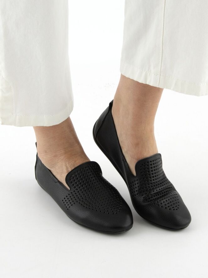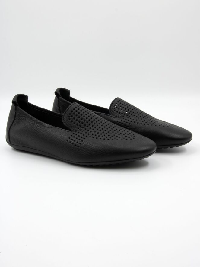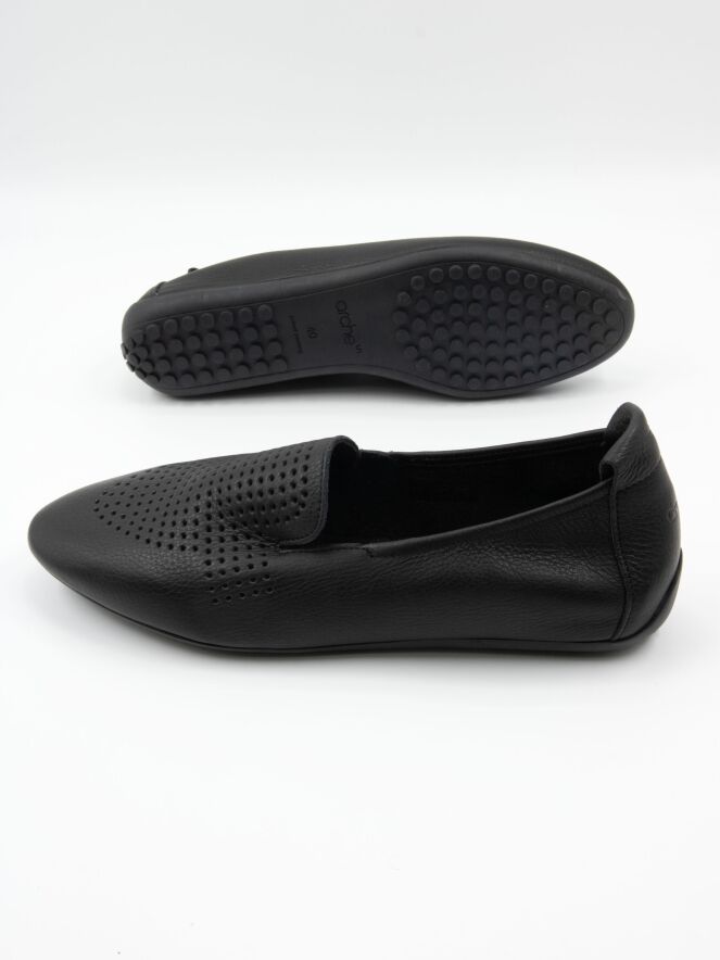Ein Slipper von Arche in Schwarz. Das Leder im Vorfußbereich ist fein perforiert. Die Sohle ist in Schwarz gehalten. Das Innere ist ungefüttert, was für zusätzliche Geschmeidigkeit und Tragekomfort sorgt.