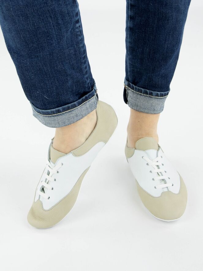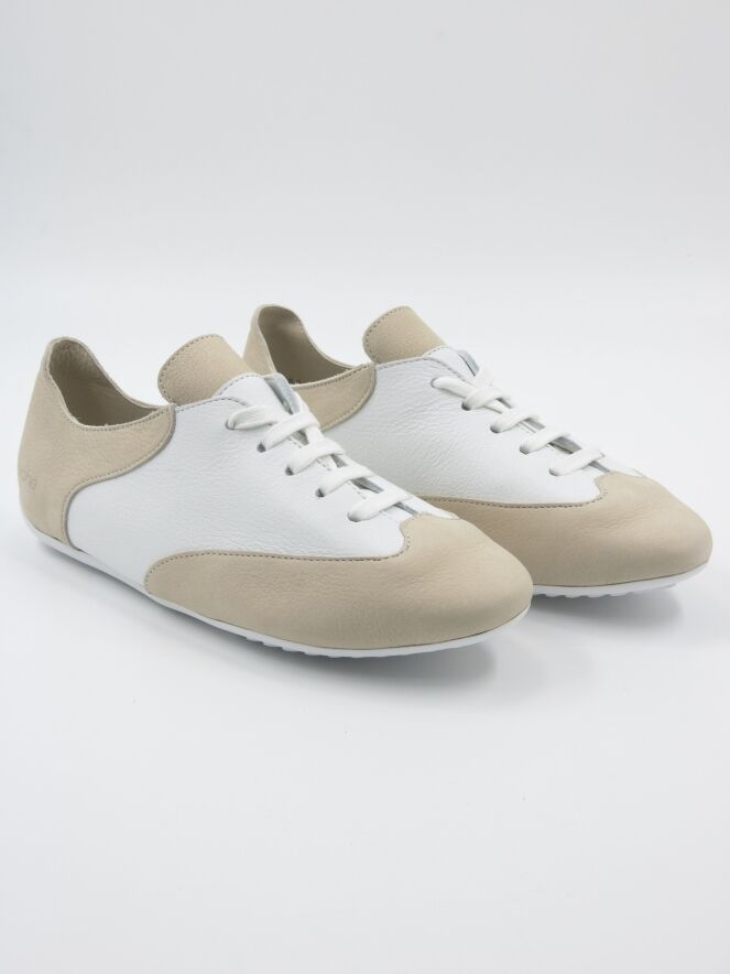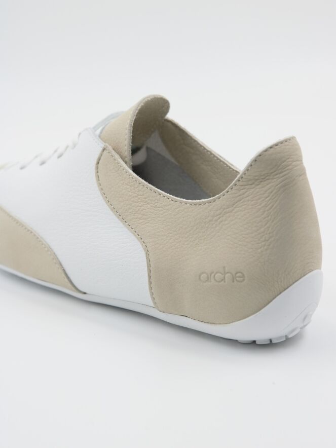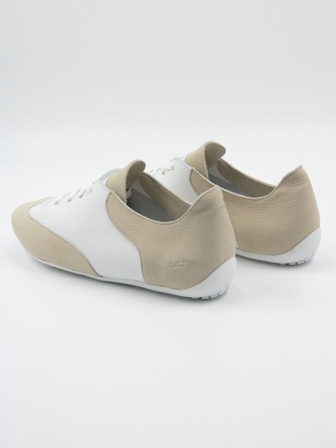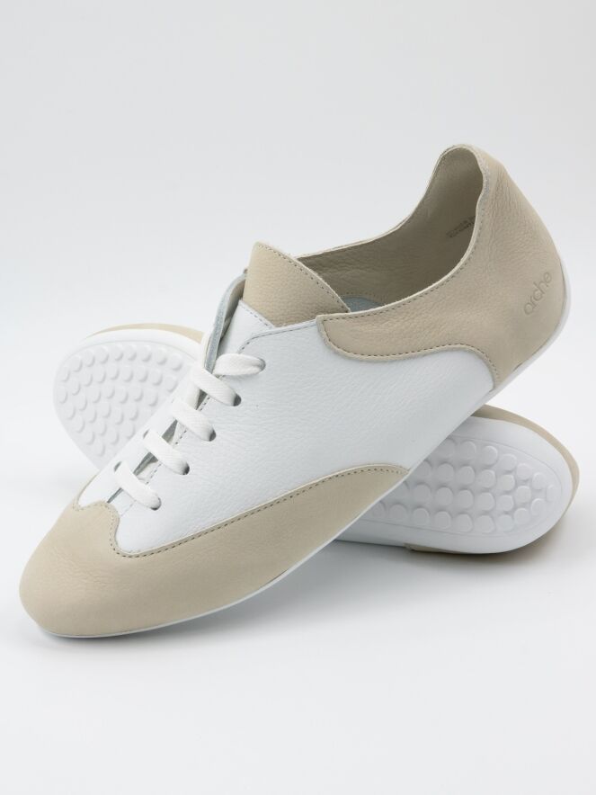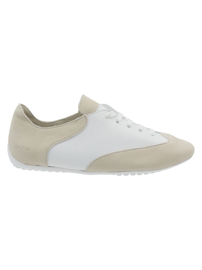 Ein Schnürschuh von Arche in den Farben Weiß und Cremeweiß. Der mittlere Teil des Schuhs ist weiß. Das Innere ist ungefüttert.