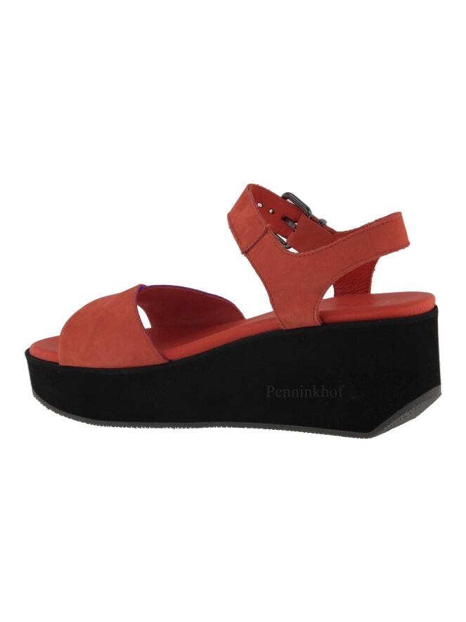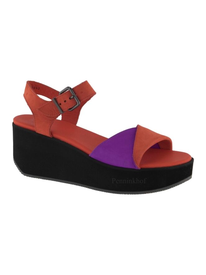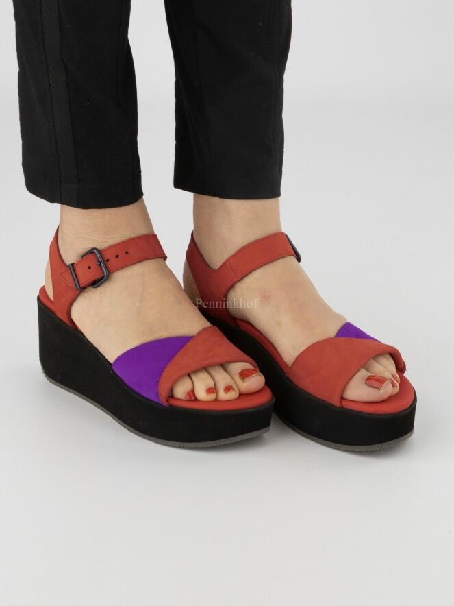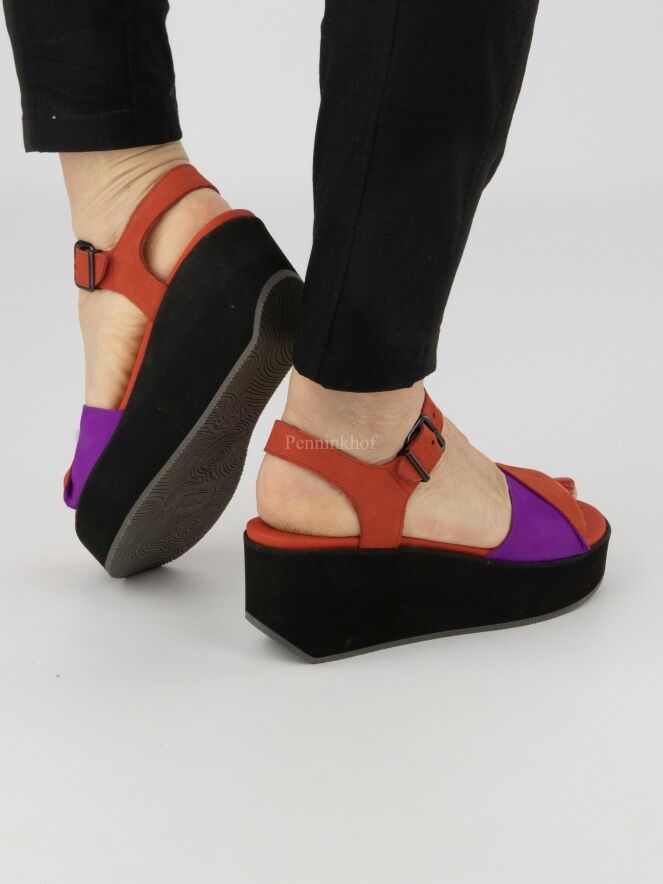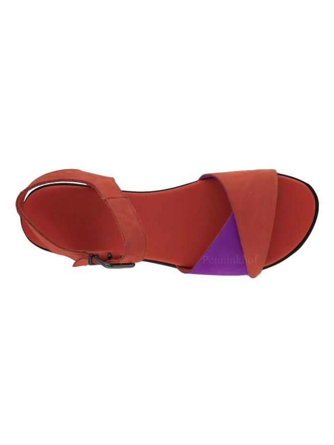 Eine Plateau-Sandale der Schuhmarke Arche in Fuchsia mit Orange. Auf dem vorderen Fußteil ist das Nubukleder umgeschlagen. Der Fersenriemen ist mit einer nickelfarbenen Schnalle verstellbar. Das dunkelviolette Fußbett ist aus Leder.