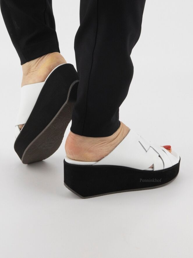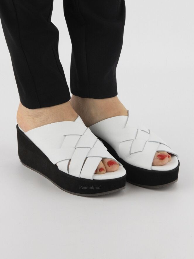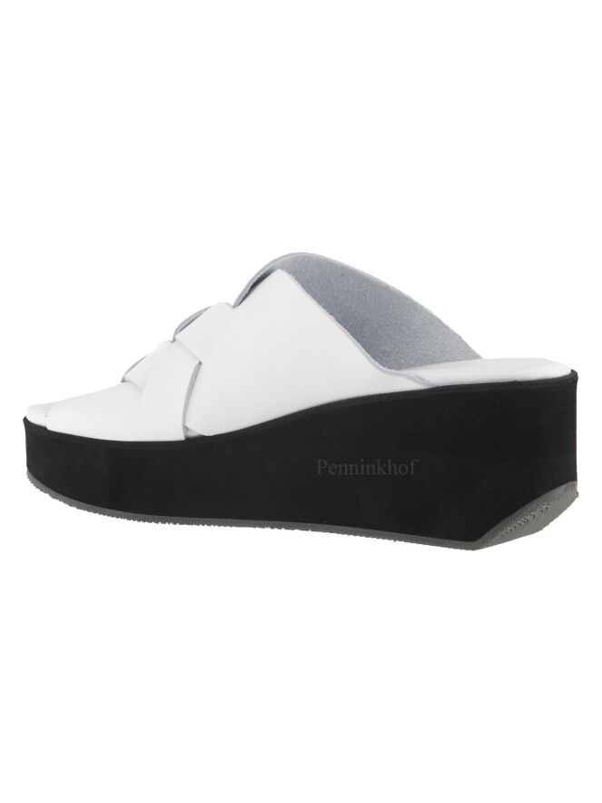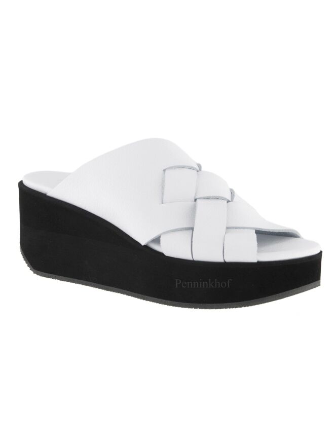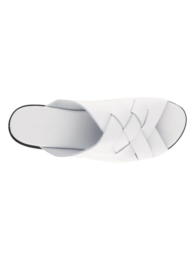 Eine weiße Plateau-Sandale der Schuhmarke Arche. Auf dem vorderen Fußteil ist das Leder geflochten. Das Fußbett ist aus dem gleichen Material und hat die gleiche Farbe wie das geflochtene Leder.