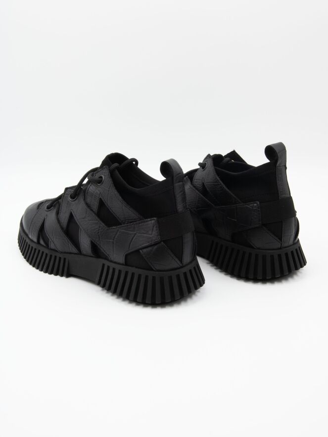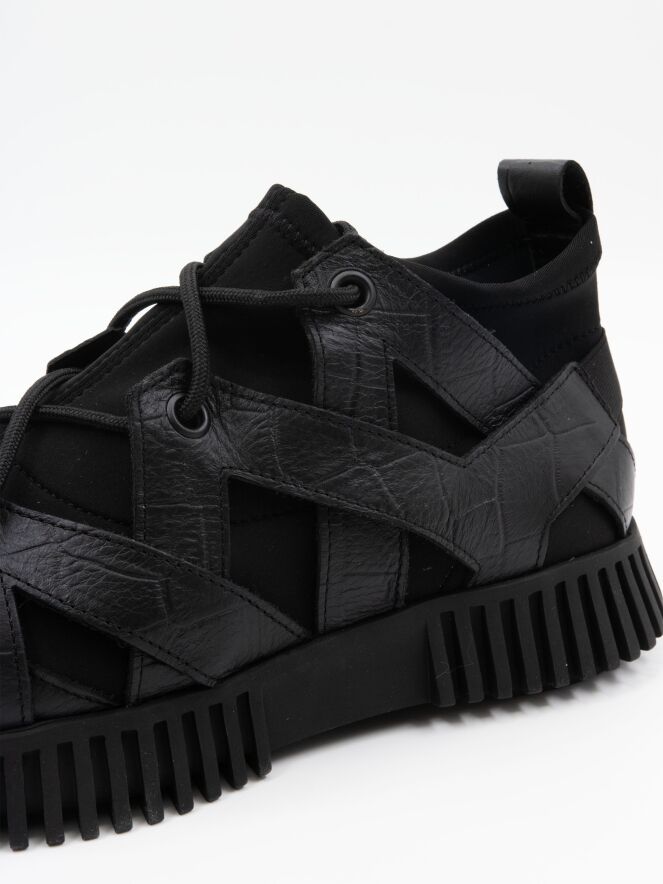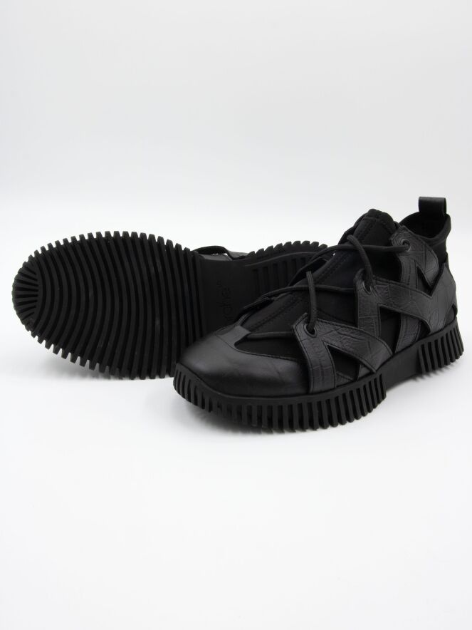 Ein Design-Sneaker von Arche aus Leder mit einem wasserdichten schwarzen Söckchen. Das Leder ist schwarz und in diagonalen Bahnen an den Seiten mit einer runden Spitze gefertigt. Das Leder ist hinten mit einem elastischen Band befestigt. Die schwarze Sohle ist geriffelt.